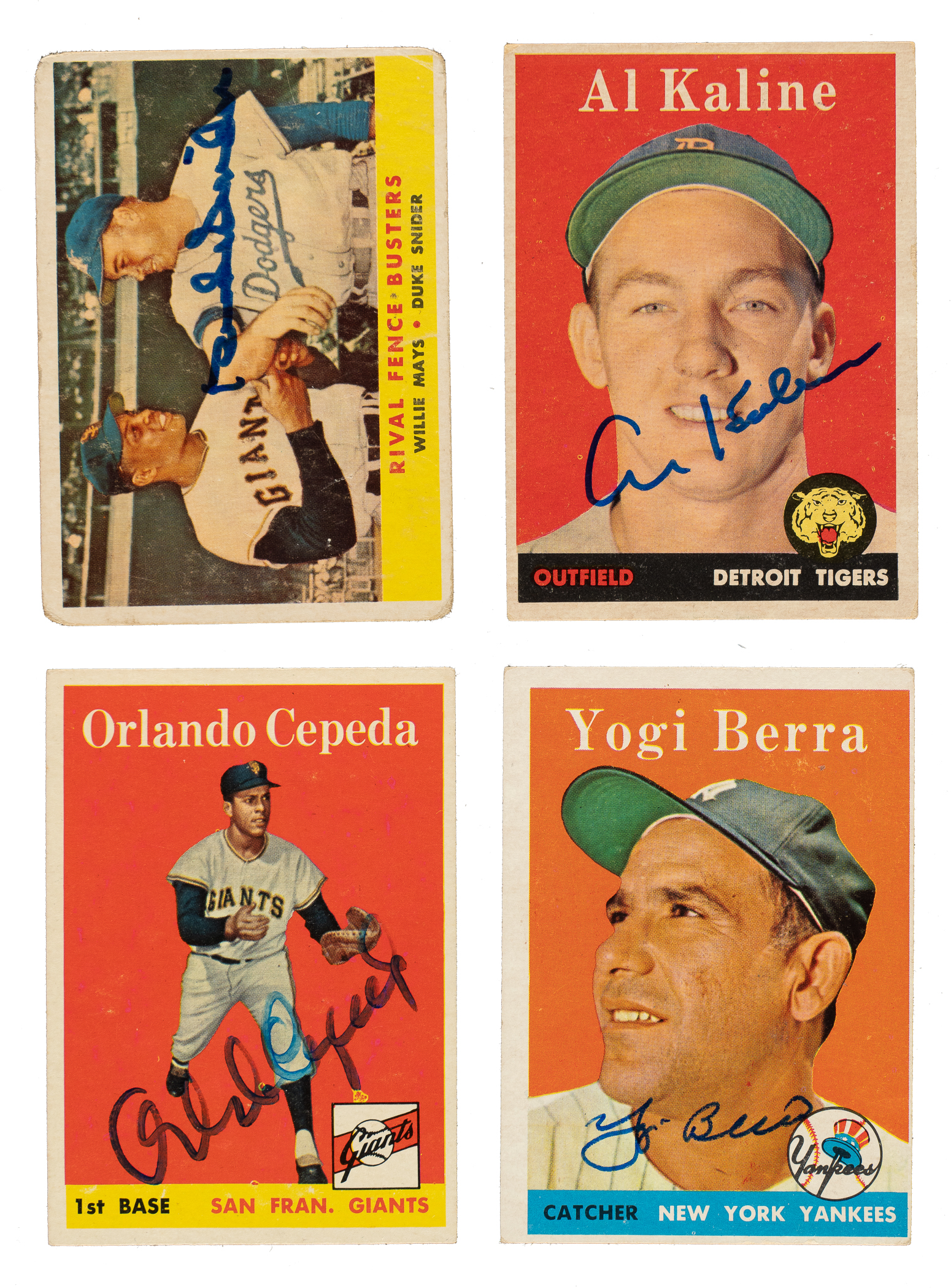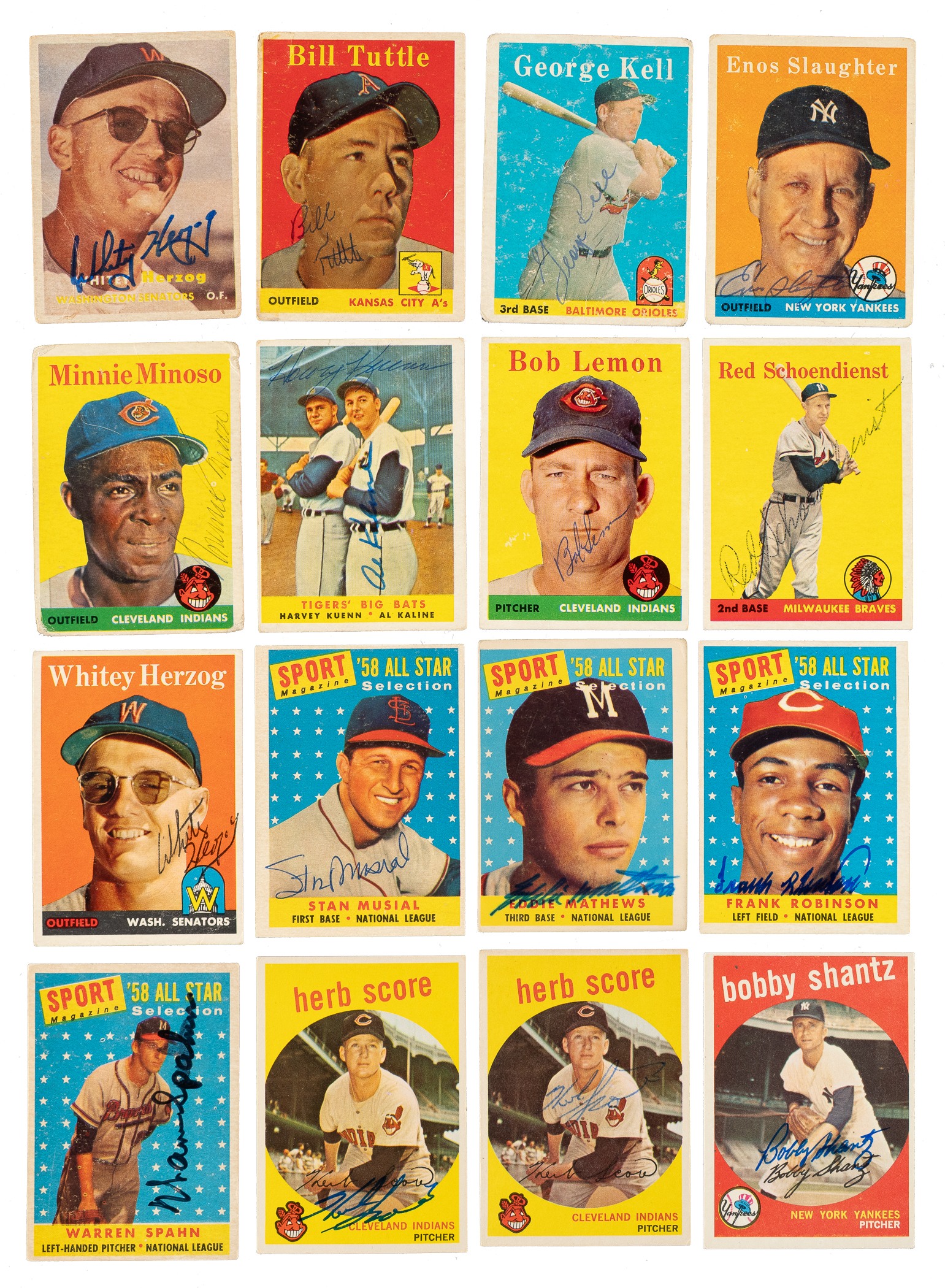 Sizable collection of 183 signed baseball cards consisting of Topps issues spanning the years 1957 to 1959, including sixteen Hall of Famers and many stars. The signatures are scripted on the front in various inks. Condition is 12% Ex or slightly better, 63% Vg to Vg-Ex, and 25% lesser. This collection consists of the following: 1) 1957 Topps (18 cards): #17, 29 Herzog RC (Gd), 52, 68, 88, 98, 127, 143, 144, 150, 157, 168, 187, 197, 218, 258, 264, and 370 (signed on reverse). 2) 1958 Topps (76 cards): #2 Lemon (Vg-Ex), 6, 22, 23a Tuttle/yellow name (slight trim, otherwise Pr), 37, 40 Kell (Pr-Fr), 45, 55, 57, 62, 63, 68, 69, 70 Kaline (Vg+), 77, 91, 98, two 135, 138, 142 Slaughter, 151, 155, 163, 168, 188, 190 Schoendienst (Ex), 197, 203, 207, 212, 225, 233, 236, 250, 263, 264, 274, 279, 283, 292, 295 Minoso (Pr-Fr), 304 Kuenn/Kaline (dual-signed, Vg), 309, 330, 334, 342, 343 Cepeda RC (Vg-Ex), 360, two 365, 370 Berra (90/10 L/R, otherwise Vg-Ex+), two 373, 379, 387, 398, 399, 405, 408 (signed by Bob Hale), 414, 428 (signed by Bell and Tebbetts), 436 Rival Fence Busters (signed by Snider, unnumbered JSA sticker on reverse, otherwise Gd), 438 Herzog, 439, 449, 450, 453, 459, 463, 476 Musial AS (Ex), 478, 480 Mathews AS (possible slight trim, otherwise Vg), 484 F. Robinson AS (Ex+), 494 Spahn AS (Vg-Ex), and 495. 3) 1959 Topps (89 cards): #2, 3, 6, 7, 24, 28, two 66, two 88 Score, 93, 96, 97, 101, 105, 112, 122, 123, 124, 133, 140, 153, two 154, 162, 171, two 182, 191, 207, 215, 218, 220, 221, 222 Shantz, 226, 230, 233, 236, two 241, 245, 246, two 249, 261, 265, 294, 301, 305, 313, two 320, two 323, 330, 334, two 340, 341, 342, 366, 367, 369, 371, 375, 378, 398, 410, 416, 417, 423, 424, 425, 438, 442, 465, 471, 472, 475, 479, 481, 489, 492, 493, 494, 498, 499, and 536. Total: 183 signed cards. Auction LOA from James Spence/JSA.