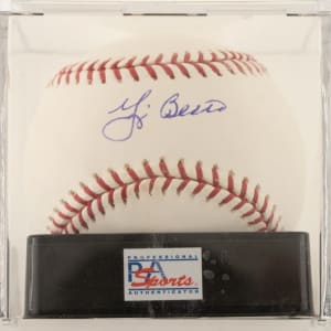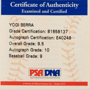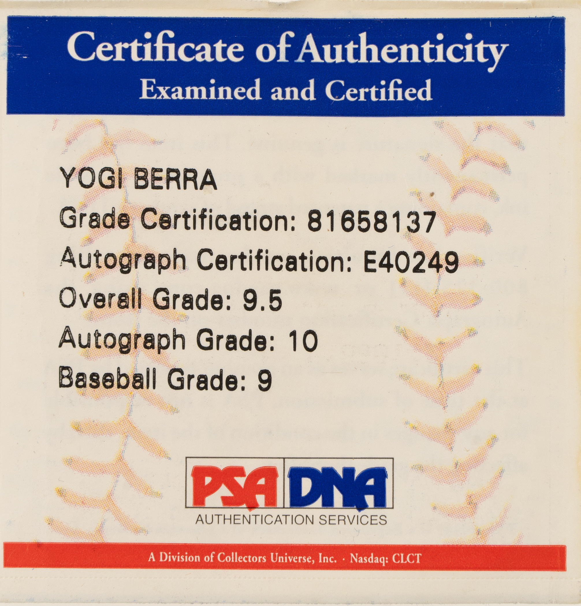 New York Yankees Hall of Famer Yogi Berra signed baseball. PSA/DNA has encapsulated the baseball, grading the signature GEM MINT 10 and the baseball MINT 9 for an overall grade of MINT+ 9.5.
