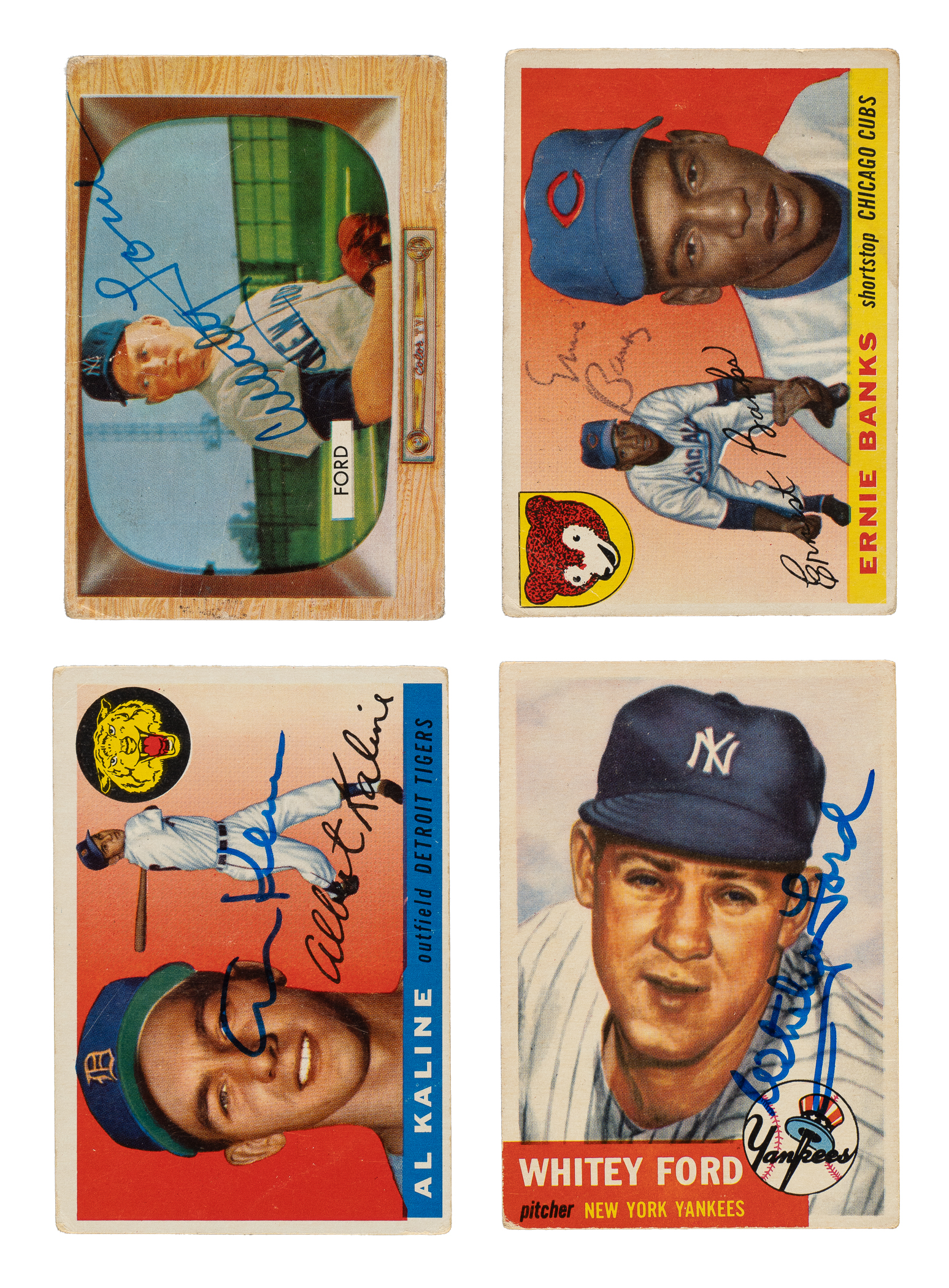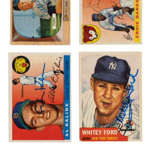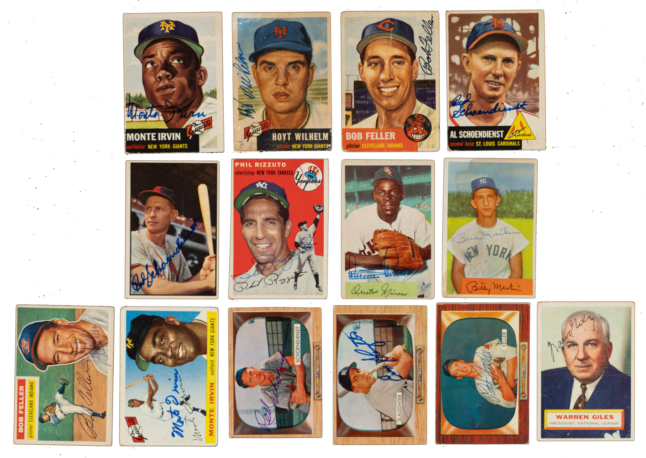 Presented is a collection of eighteen signed baseball cards consisting of Topps and Bowman issues spanning the years 1953 to 1956. The signatures are scripted on the front in various inks. This collection consists of the following: 1) 1953 Topps (5 cards): #54 Feller (Pr-Fr), 62 Irvin (Pr due mostly to paper loss on reverse), 78 Schoendienst (Gd), 151 Wilhelm SP (Pr), and 207 Ford (Gd+). 2) 1953 Bowman Color (1 card): #101 Schoendienst (measures a bit small, otherwise Gd+). 3) 1954 Topps (1 card): #17 Rizzuto (Vg). 4) 1954 Bowman (2 cards): #38 Minoso (90/10 T/B, otherwise Vg) and 145 Martin (Pr). 5) 1955 Topps (3 cards): #4 Kaline (Gd), 28 Banks (Fr), and 100 Irvin (Gd). 6) 1955 Bowman (4 cards): #29 Schoendienst (trimmed, otherwise Vg), 59 Ford (Pr-Fr), 60 Slaughter (Gd), and 134 Feller (Vg+). 7) 1956 Topps (2 cards): #2 Giles (Fr) and 200 Feller (Pr due mostly to tack hole). Total: 18 signed cards. Auction LOA from James Spence/JSA.