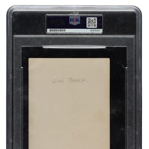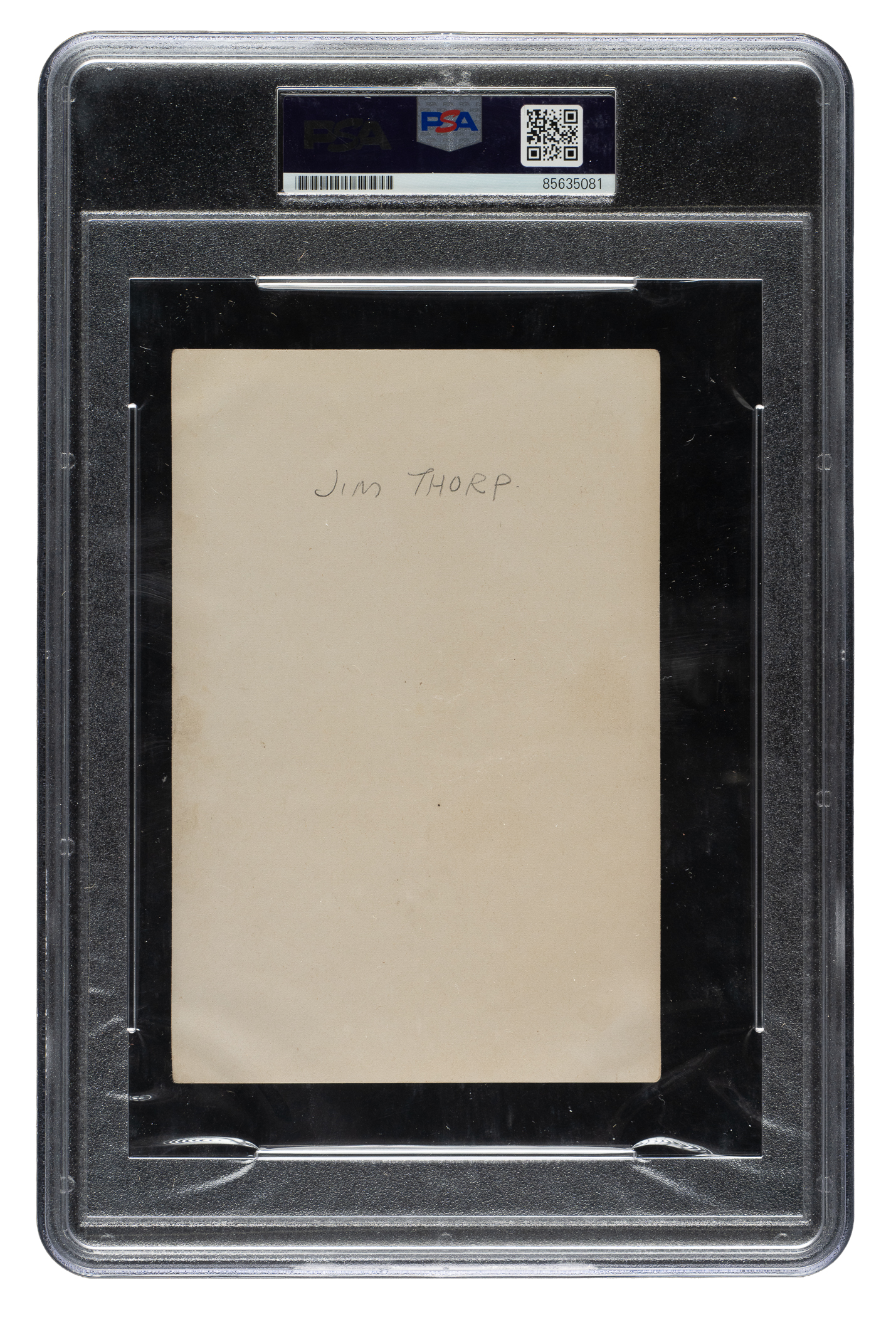 Vintage photo of Jim Thorpe during his time at Carlisle Indian Industrial School in Carlisle, Pennsylvania. Encapsulated and certified as an original Type III photo by PSA/DNA. Per PSA/DNA, the "photo is a period example that was made from a duplicate negative." Thorpe is captured posing for the camera in his Carlisle uniform. His name is written in pencil on the reverse. During his time at Carlisle, Thorpe competed in several sports, including track and field, baseball, and lacrosse. His greatest success, however, came on the gridiron, where he was a first-team All-American in 1911 and 1912. The photo, which has been trimmed to its current dimensions of 4 x 6 inches, is in Very Good to Excellent condition overall.