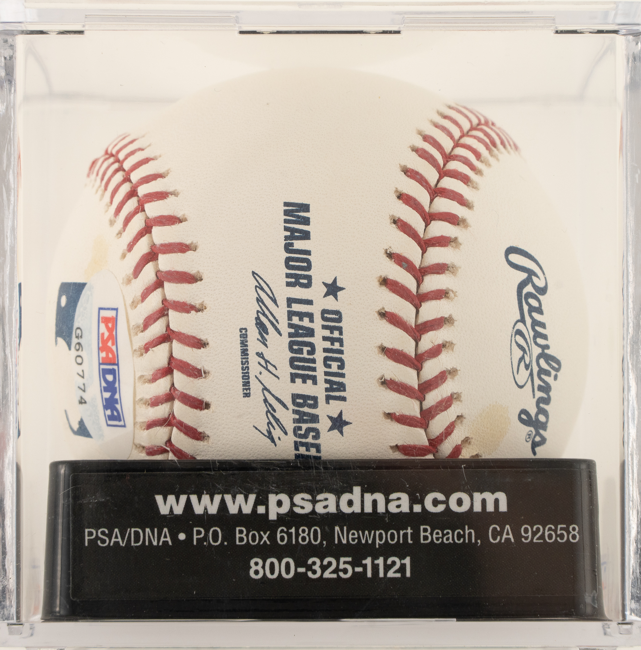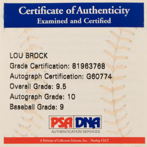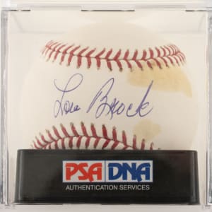 St. Louis Cardinals Hall of Famer Lou Brock signed baseball. PSA/DNA has encapsulated the baseball, grading the signature GEM MINT 10 and the baseball MINT 9 for an overall grade of MINT+ 9.5.