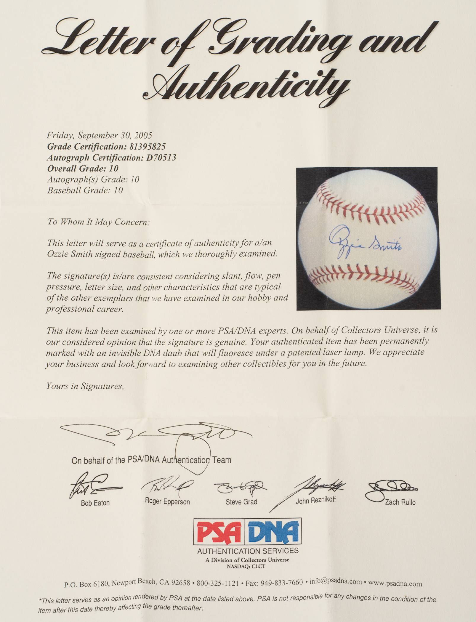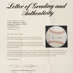 St. Louis Cardinals Hall of Famer Ozzie Smith signed baseball. PSA/DNA has encapsulated the baseball, grading the signature GEM MINT 10 and the baseball GEM MINT 10 for an overall grade of GEM MINT 10.
