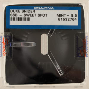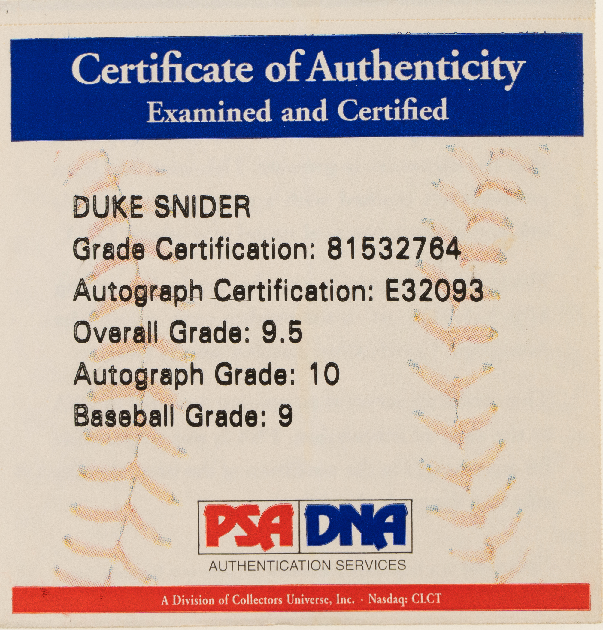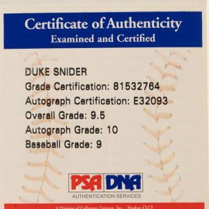 Los Angeles Dodgers Hall of Famer Duke Snider signed baseball. PSA/DNA has encapsulated the baseball, grading the signature GEM MINT 10 and the baseball MINT 9 for an overall grade of MINT+ 9.5.