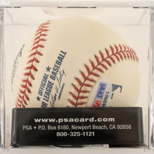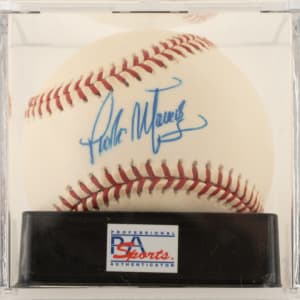Boston Red Sox Hall of Famer Pedro Martinez signed baseball. PSA/DNA has encapsulated the baseball, grading the signature NM-MT 8 and the baseball NM-MT 8 for an overall grade of NM-MT 8.