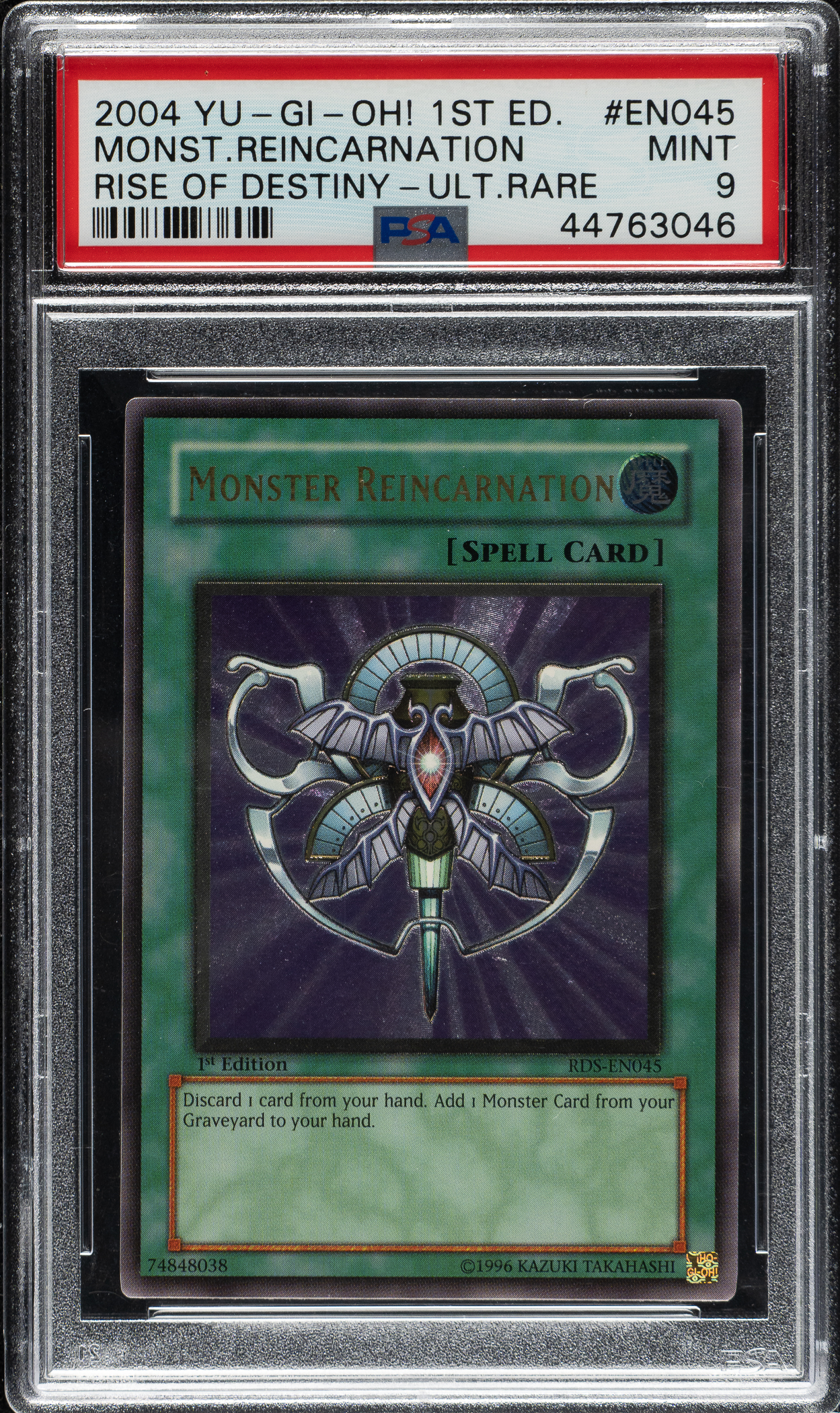 Lot 2763 2004 Yu-Gi-Oh! Rise of Destiny 1st Edition #EN045 Monster Reincarnation Super Rare PSA MINT 9
