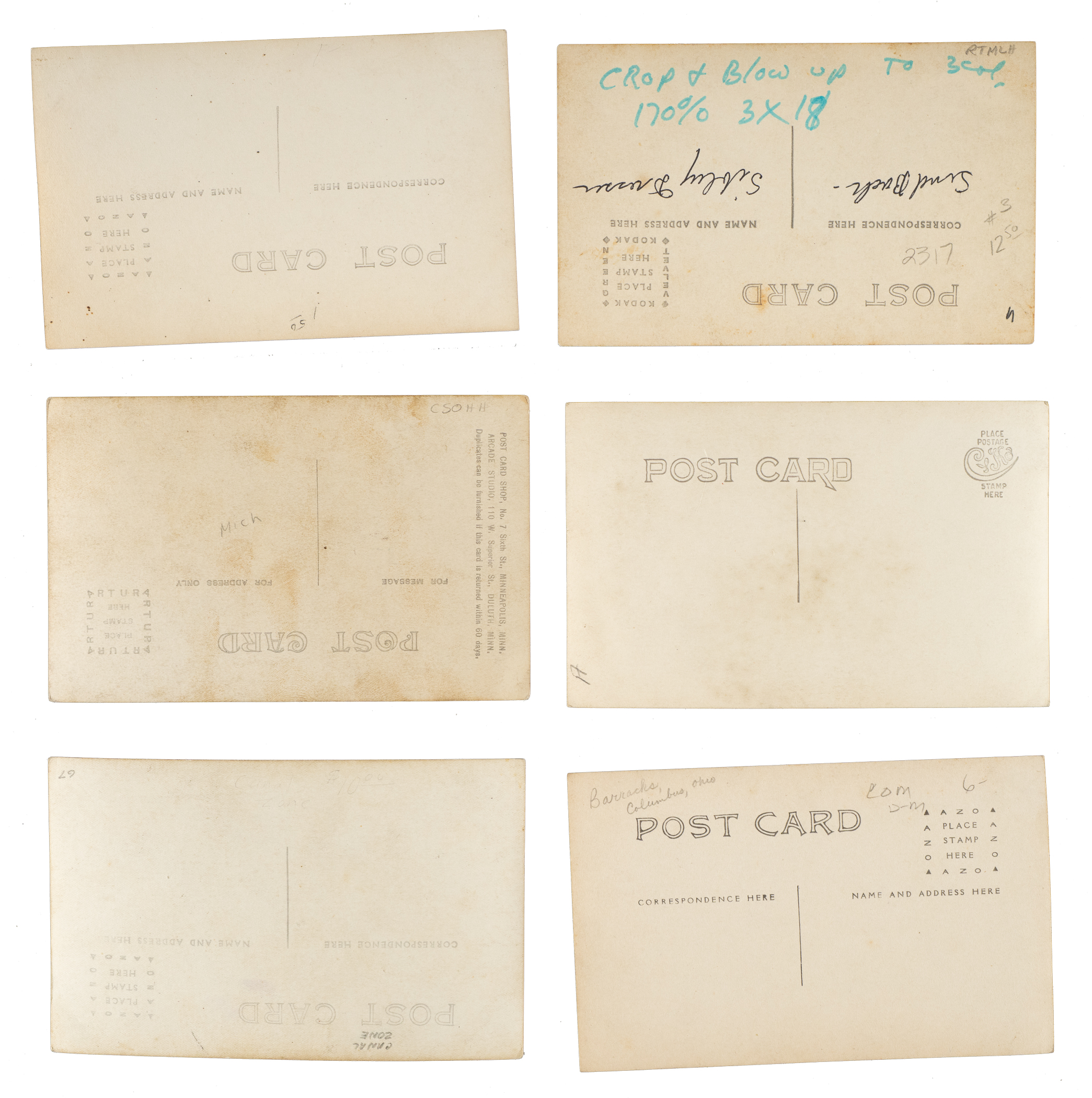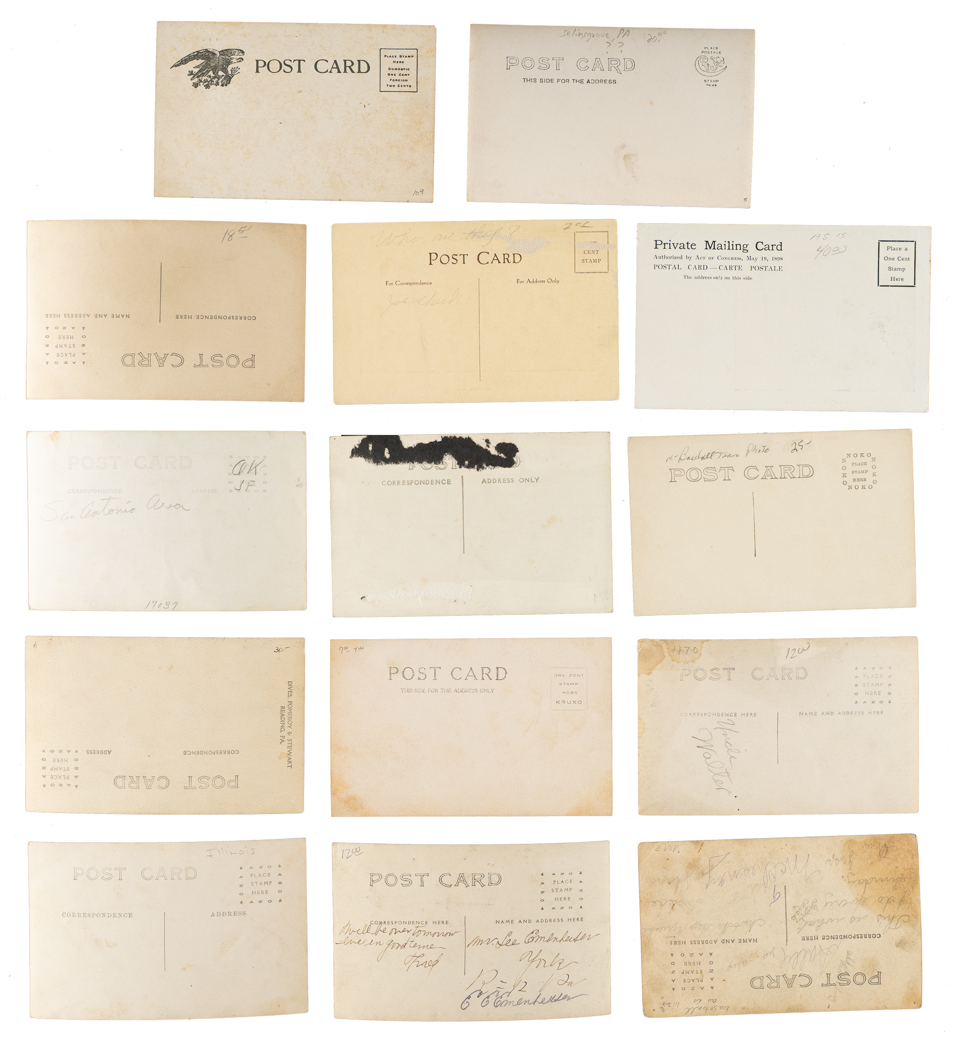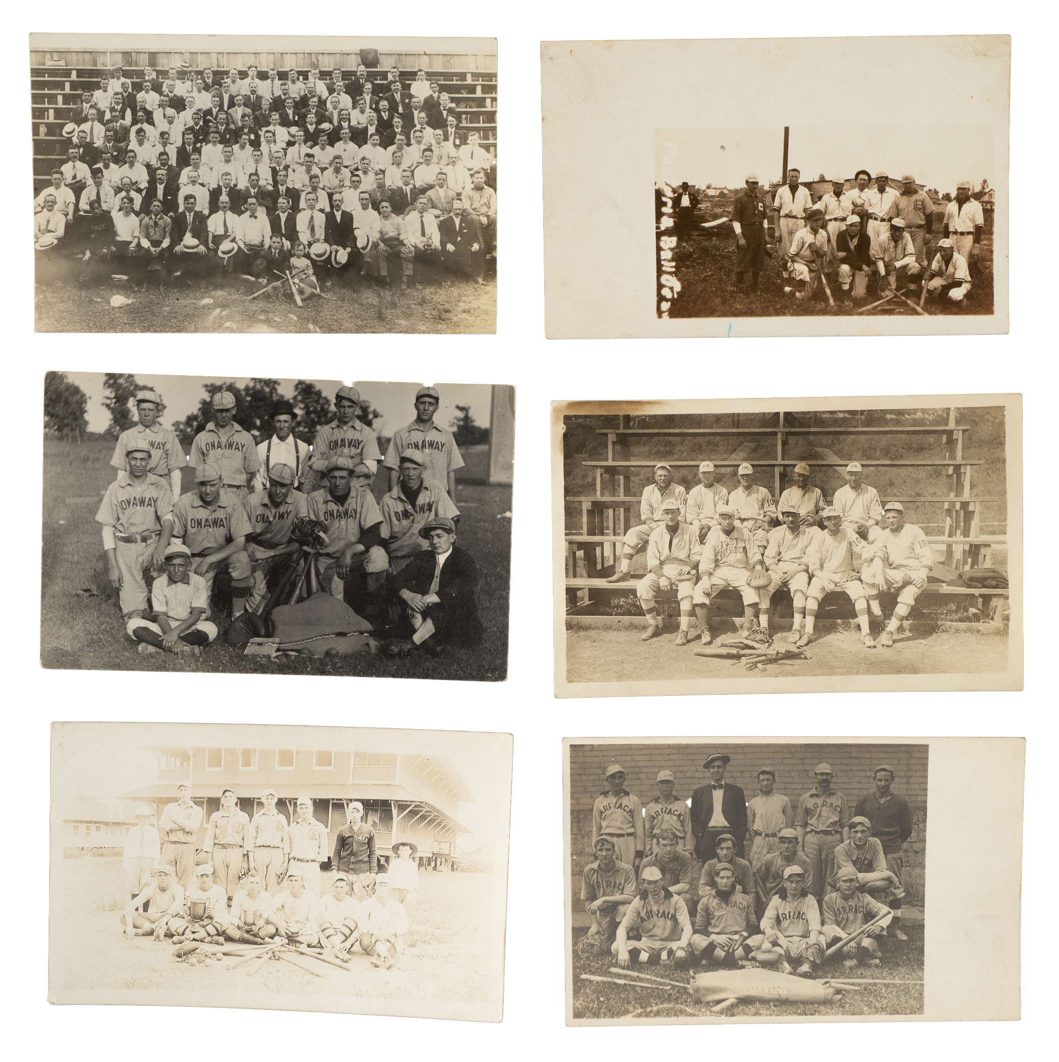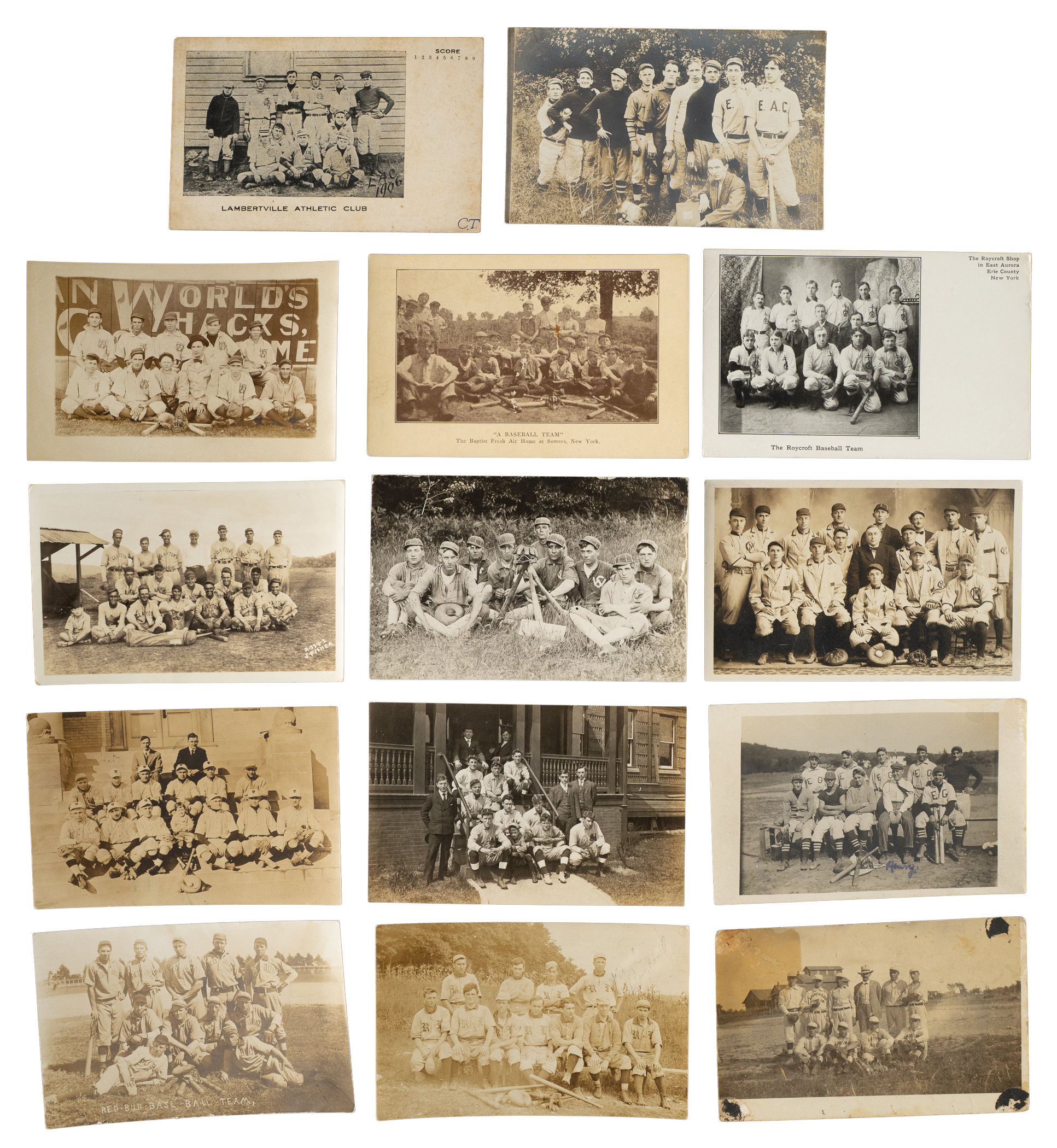 Collection of twenty team postcards (mostly the real-photo variety) depicting 1900s- to 1930s-era baseball teams, presumably from the regional amateur, semi-pro, and youth ranks. One postcard shows a large group in street clothes with a display of baseball equipment in the front. The collection as a whole technically ranges from Pr to Fr, with most offering a very presentable appearance from the fronts. Total: 20 postcards.