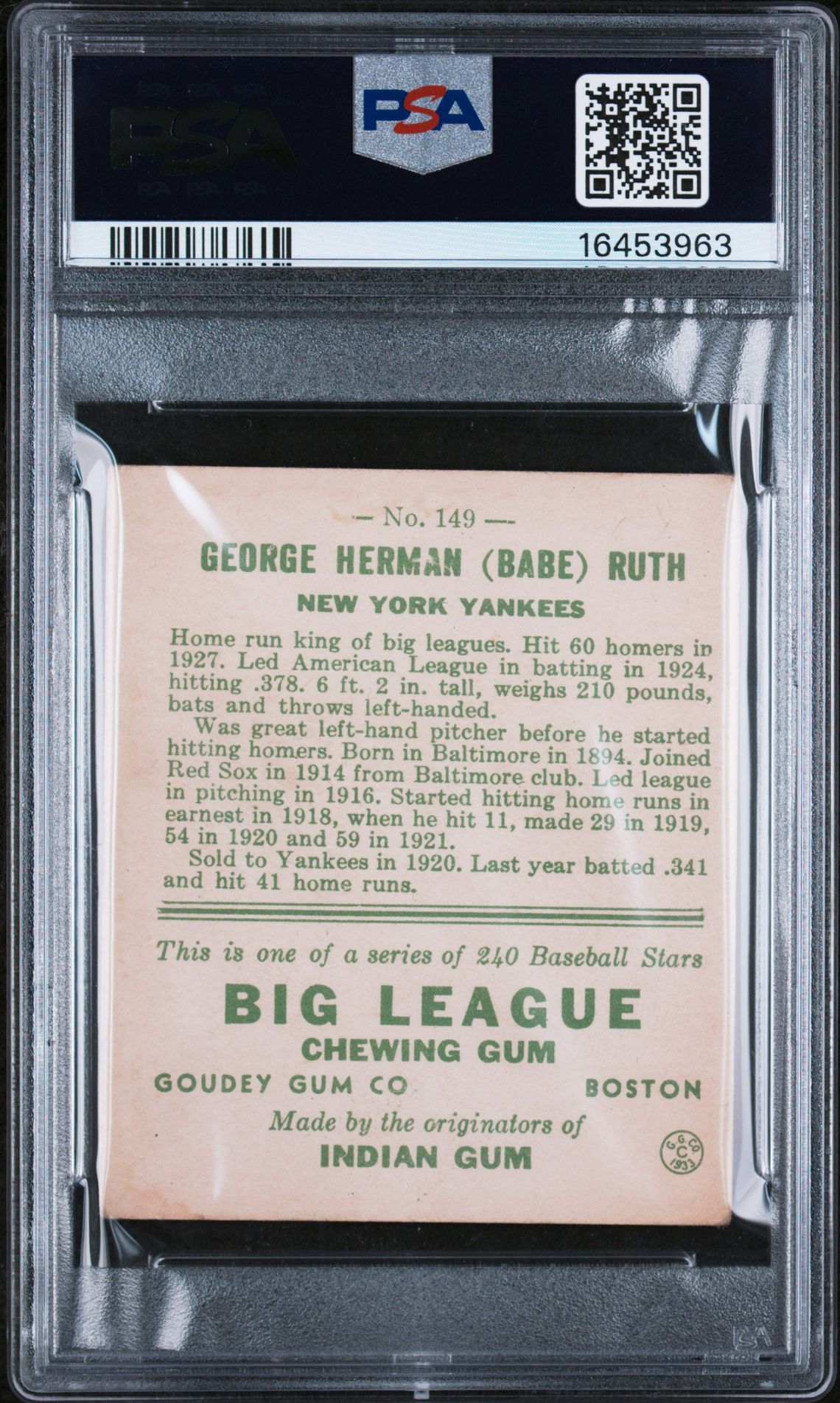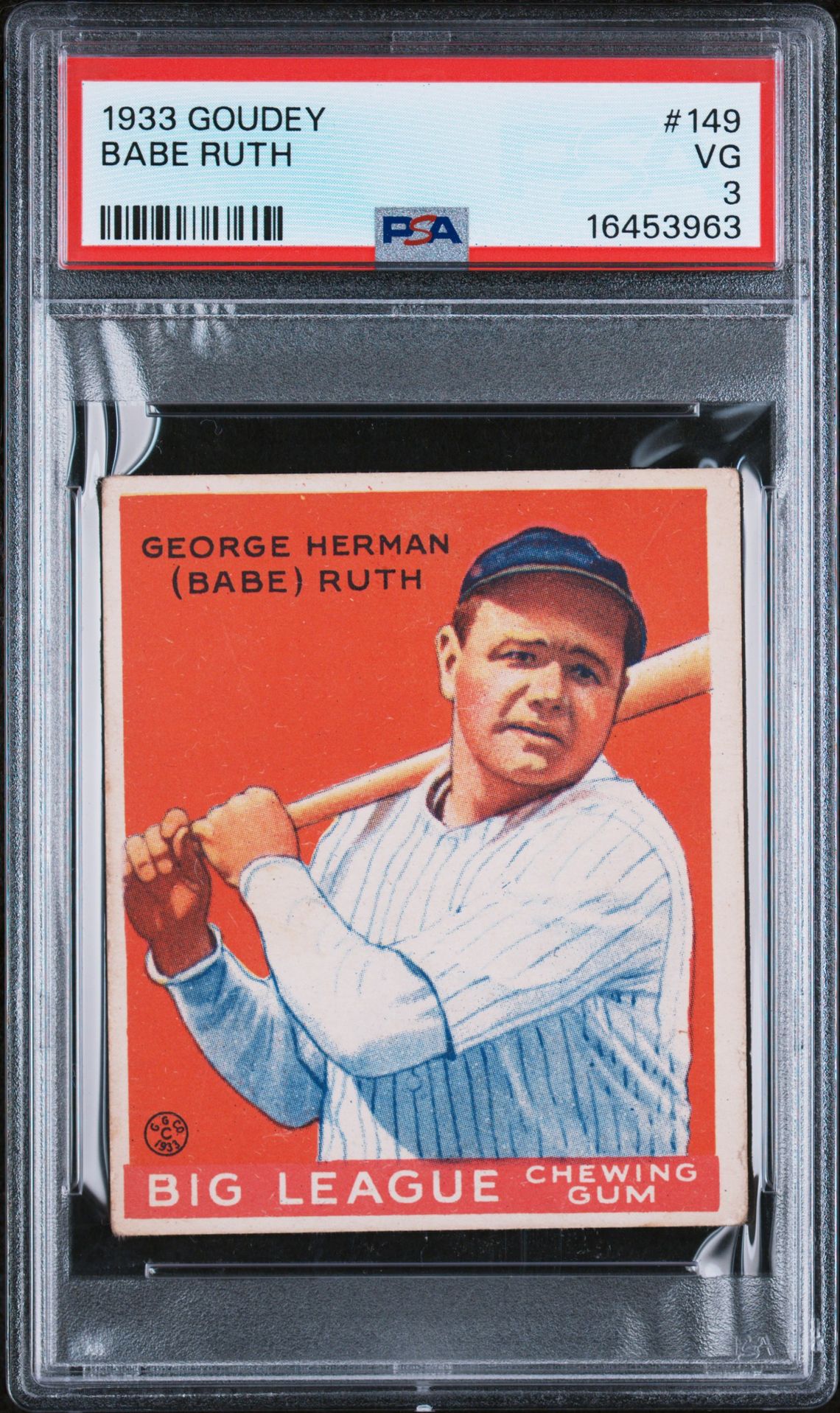 Graded VG 3 by PSA. Strong mid-grade example of one of New York Yankees Hall of Famer Babe Ruth’s most famous and classic cards: #149 (red background) from the 1933 Goudey series. This card has a beautiful red background, a crisp image, and moderate corner wear. A vertical crease on the lower-right quadrant contributes to the assigned grade. In an extremely desirable condition, this is an ideal card for the collector who wants an appealing 1933 Goudey #149 Babe Ruth but is not interested in spending the tens of thousands of dollars an example in a significantly higher grade would cost.