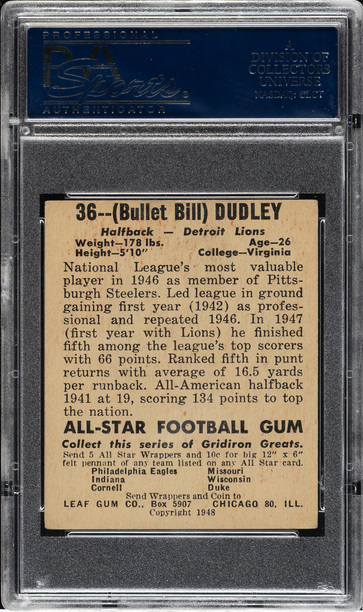 Lot # 2442: 1948 Leaf Football #36 Bill Dudley Rookie PSA VG-EX 4