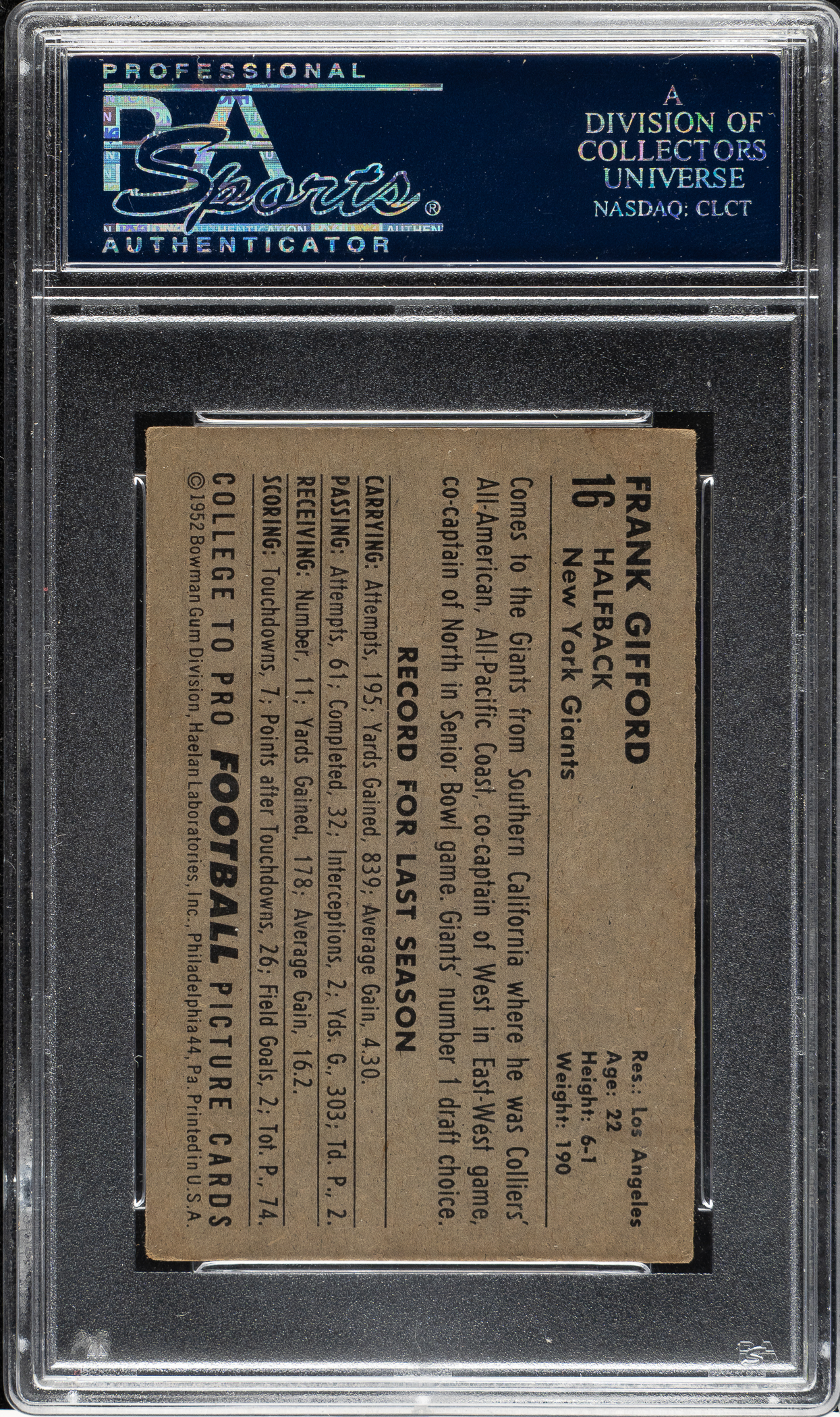 Lot # 2449: 1952 Bowman Large Football #16 Frank Gifford Rookie PSA VG-EX 4