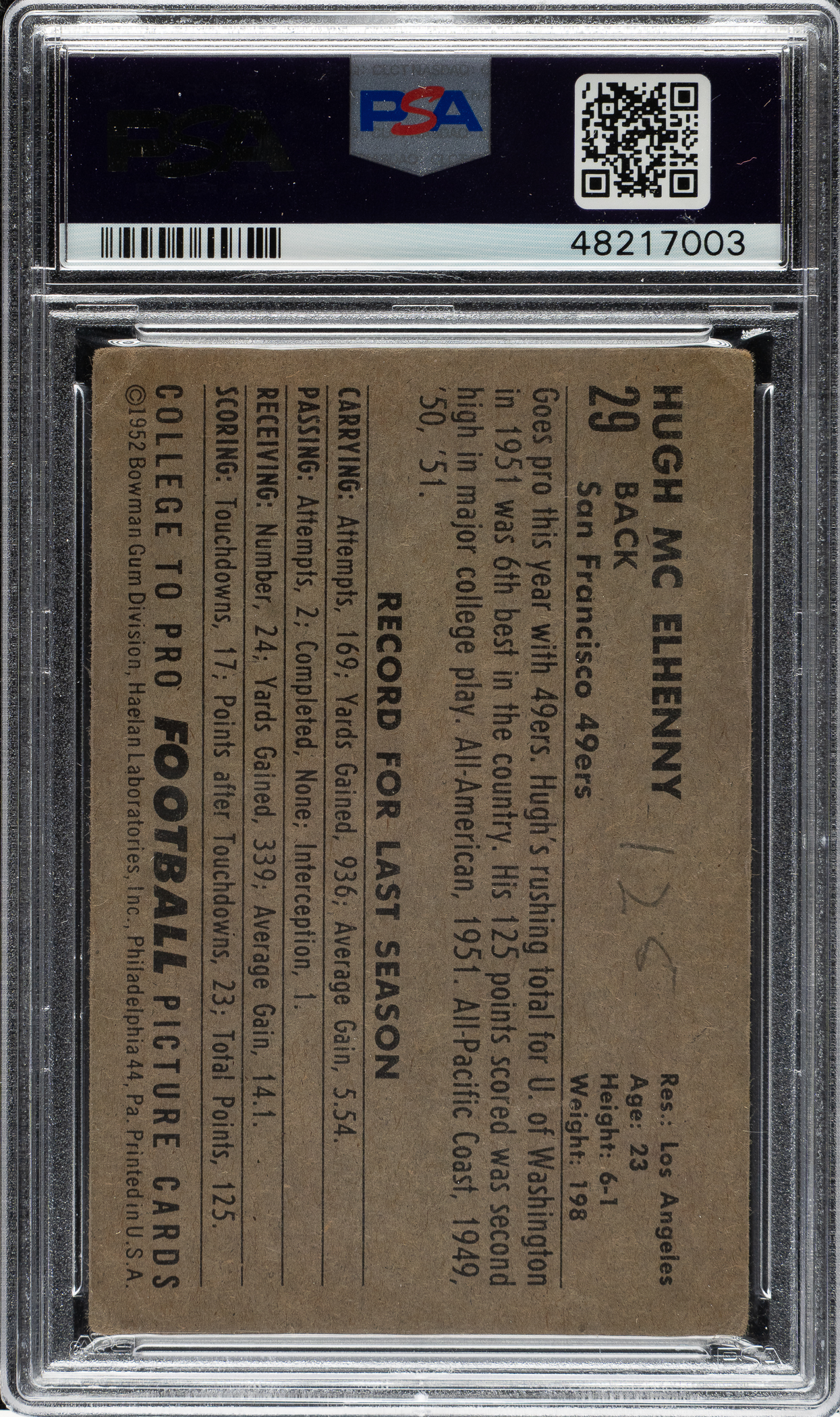 Graded GOOD 2 (MK) by PSA. San Francisco 49ers football Hall of Famer Hugh McElhenny.