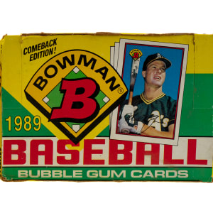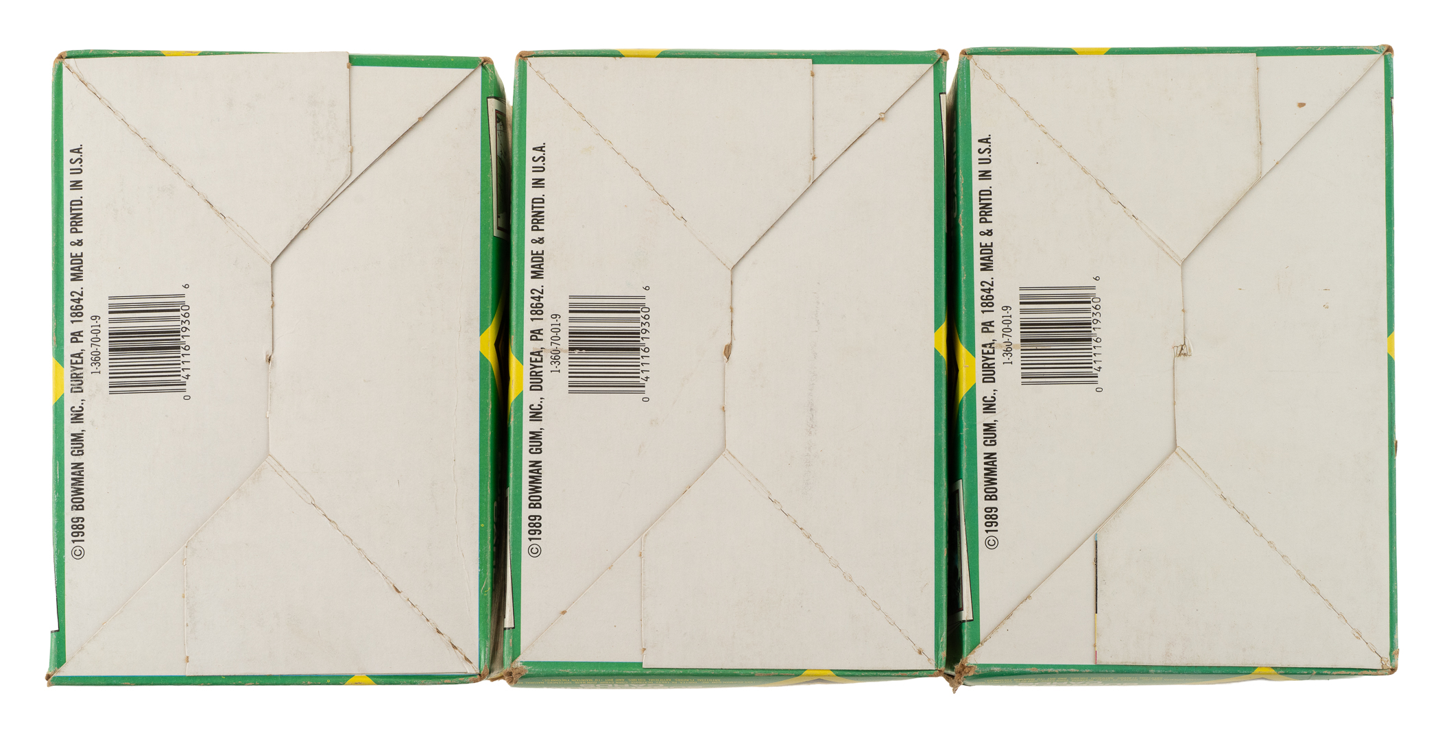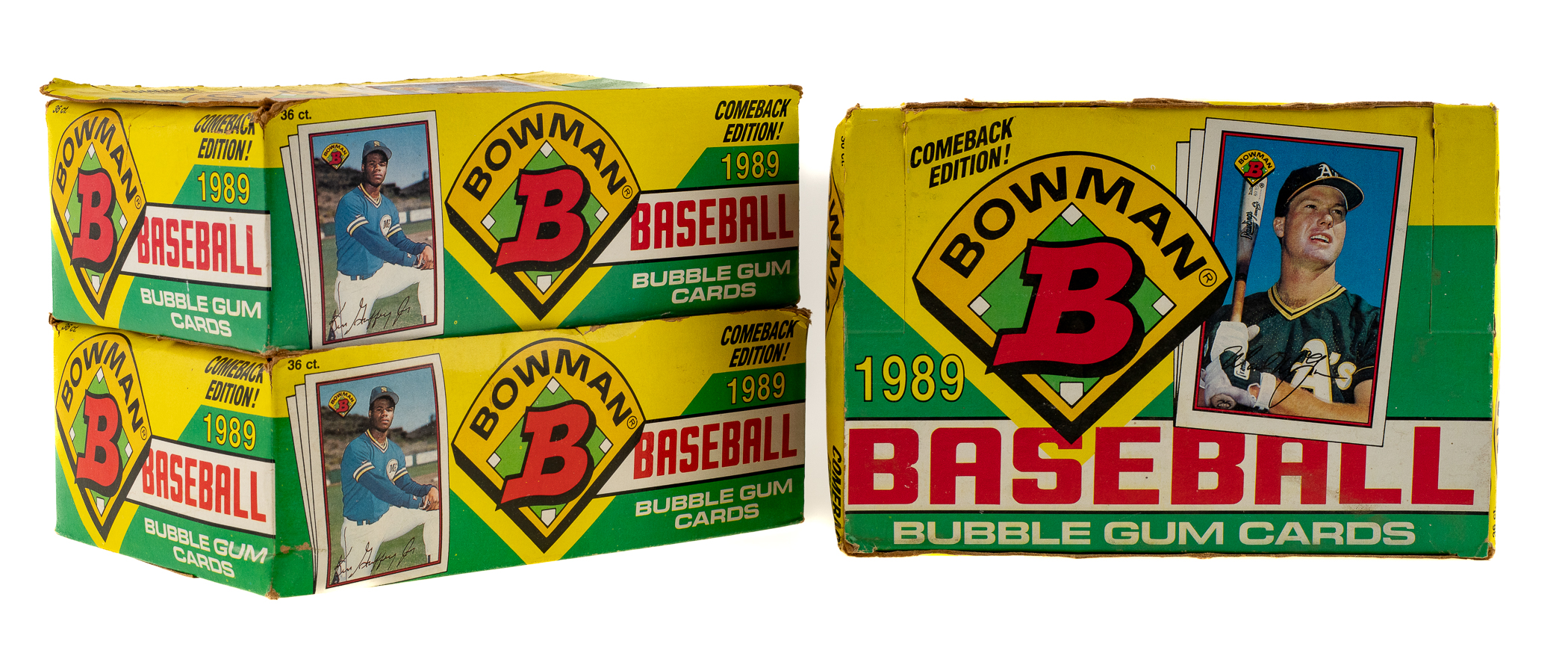 Trio of unopened boxes from 1989 Bowman baseball. Hall of Famer Ken Griffey Jr.'s rookie card appears in this set. The boxes display shelf wear, including one box with slightly detached flaps, but the packs remain bright and clean. Total: 3 boxes. The size/weight of this item requires that there will be an additional shipping charge for this lot.