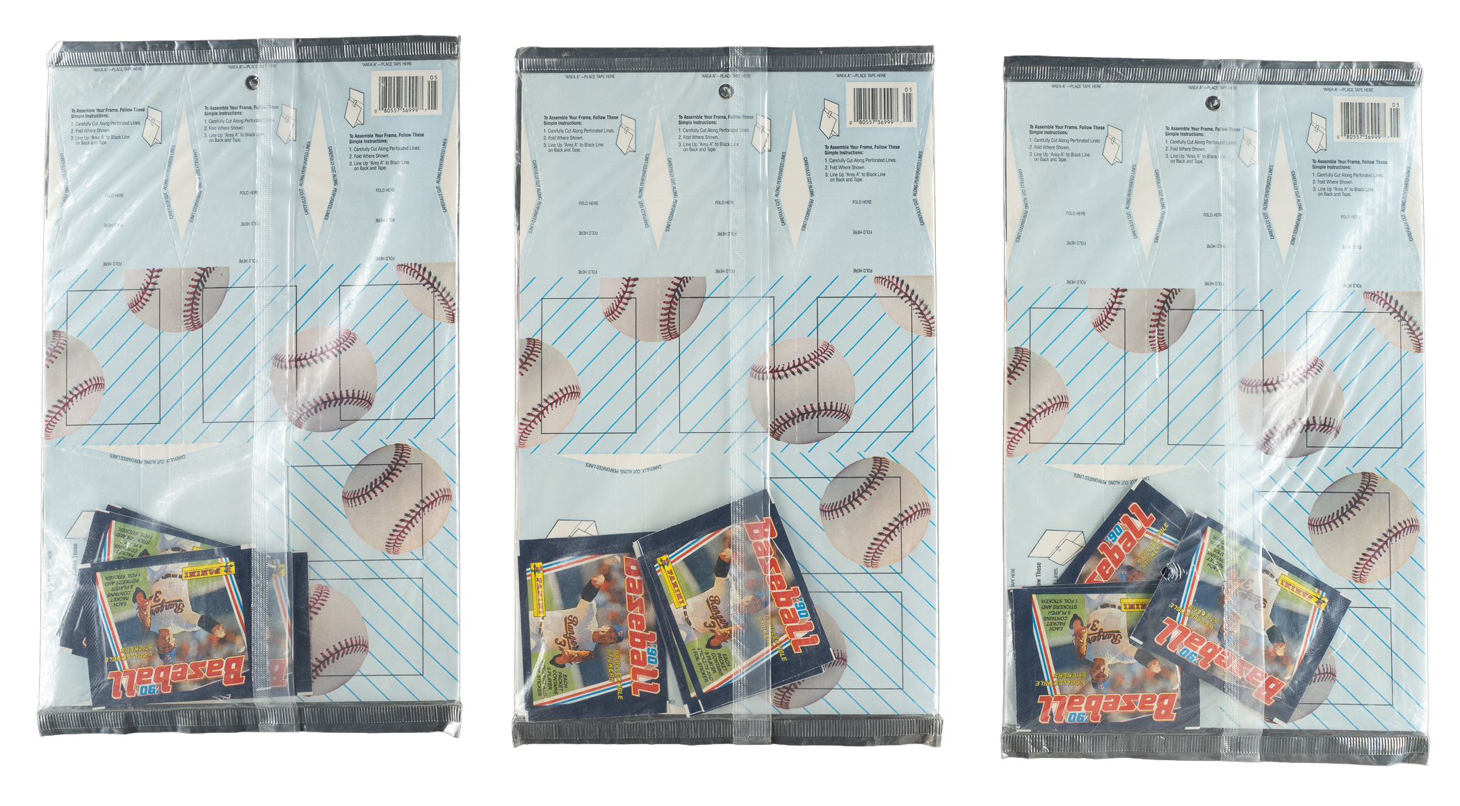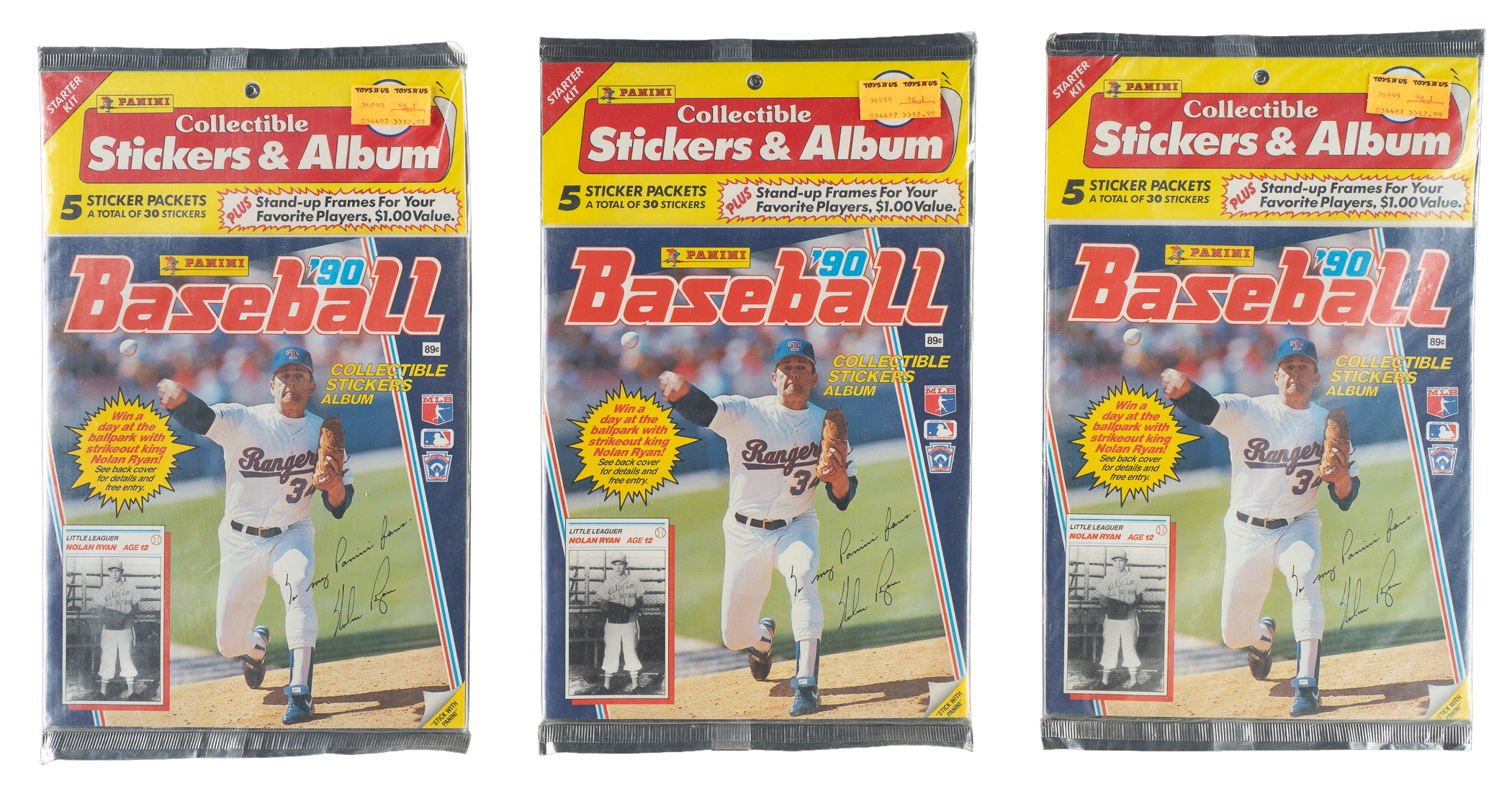 Trio of unopened 1990 Panini Sticker albums, each sealed in its original display with price stickers on front. Featuring Hall of Famer Nolan Ryan on front, each sealed album display contains five unopened packs of stickers. Very Good to Excellent condition overall. Total: 3 sealed album displays containing 15 packs. The size/weight of this item requires that there will be an additional shipping charge for this lot.