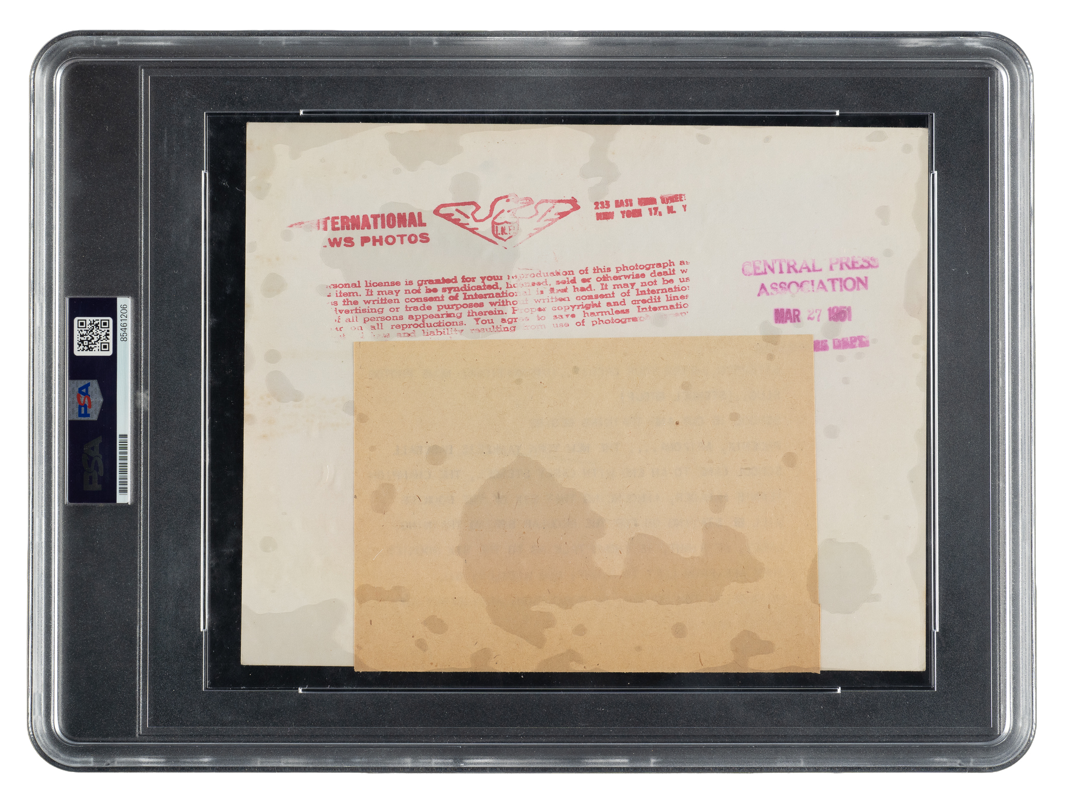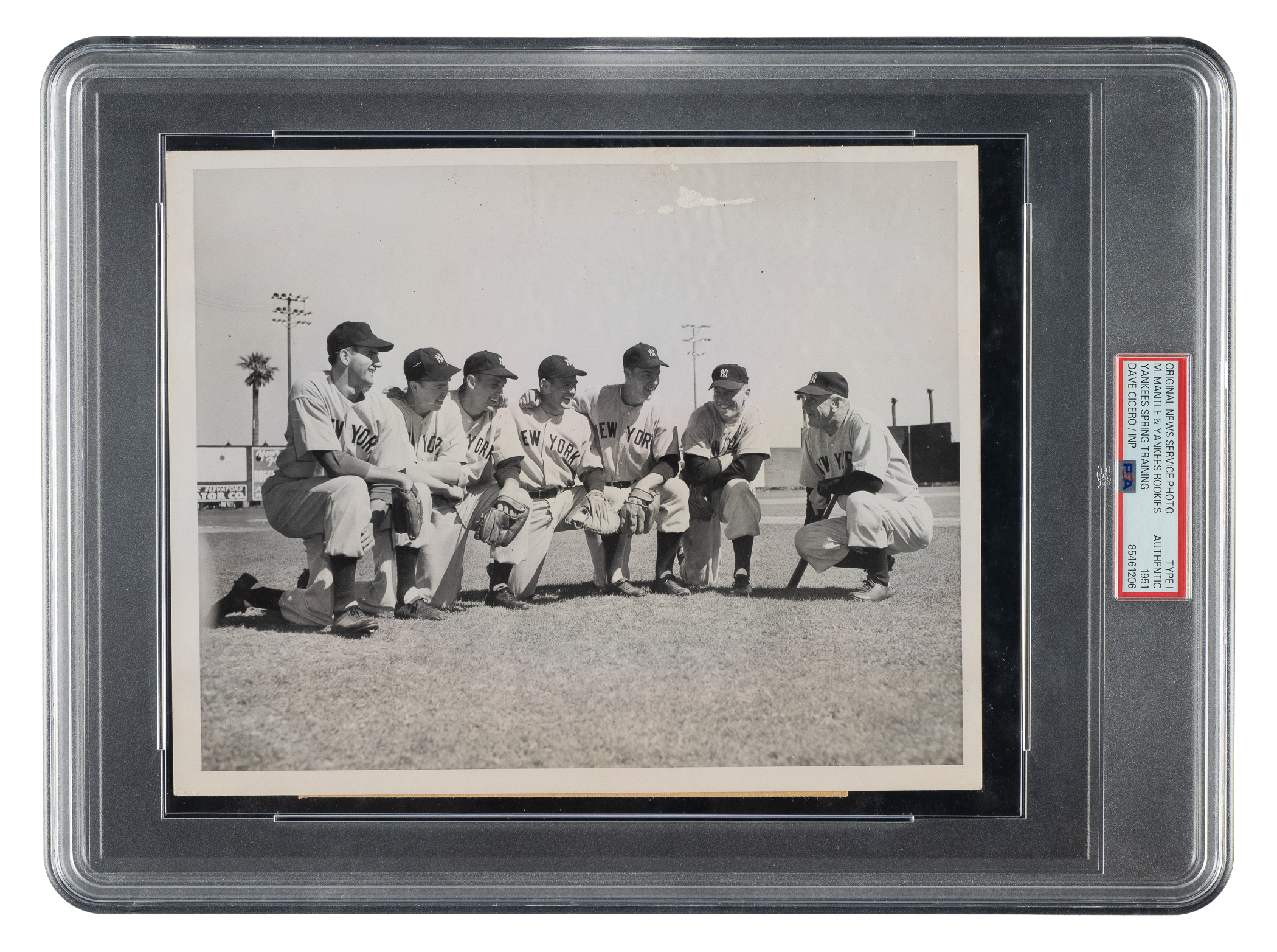 Original news photograph capturing seven members of the New York Yankees, including Mickey Mantle as a rookie and manager Casey Stengel, before spring training on February 27 or 28 in 1951 (the date is based on the fact that this image was used in The Arizona Republic newspaper the morning of March 1). The players are pictured posing together on the field in their away uniforms. In 1951, for the first and only time in the club's history, the Yankees headed West instead of South for spring training, opening camp in Phoenix, Arizona. While news of DiMaggio's impending retirement at season's end was already circulating, it wasn't the biggest story in camp that spring. Most of the media attention was focused on a young outfielder who could hit with incredible power from both sides of the plate and run like a deer. His name was Mickey Mantle, and his performance in the desert was already drawing comparisons to Ruth, Gehrig, and, in hushed tones, even DiMaggio. Encapsulated and certified as an original Type I photograph by PSA/DNA. An original paper news caption dated "3-4-51" appears on the reverse, as well as an "International News Photos" credit stamp and a second date stamp "Mar 27 1951." Because this photo dates from prior to spring training of 1951, it holds the distinction of being one of the earliest photos ever to feature Mantle as a member of the New York Yankees. The photo (9 x 7-1/8 inches) has light creases (including a horizontal crease extending across the central image area) and a small spot of paper loss near the top border. In Good condition overall.