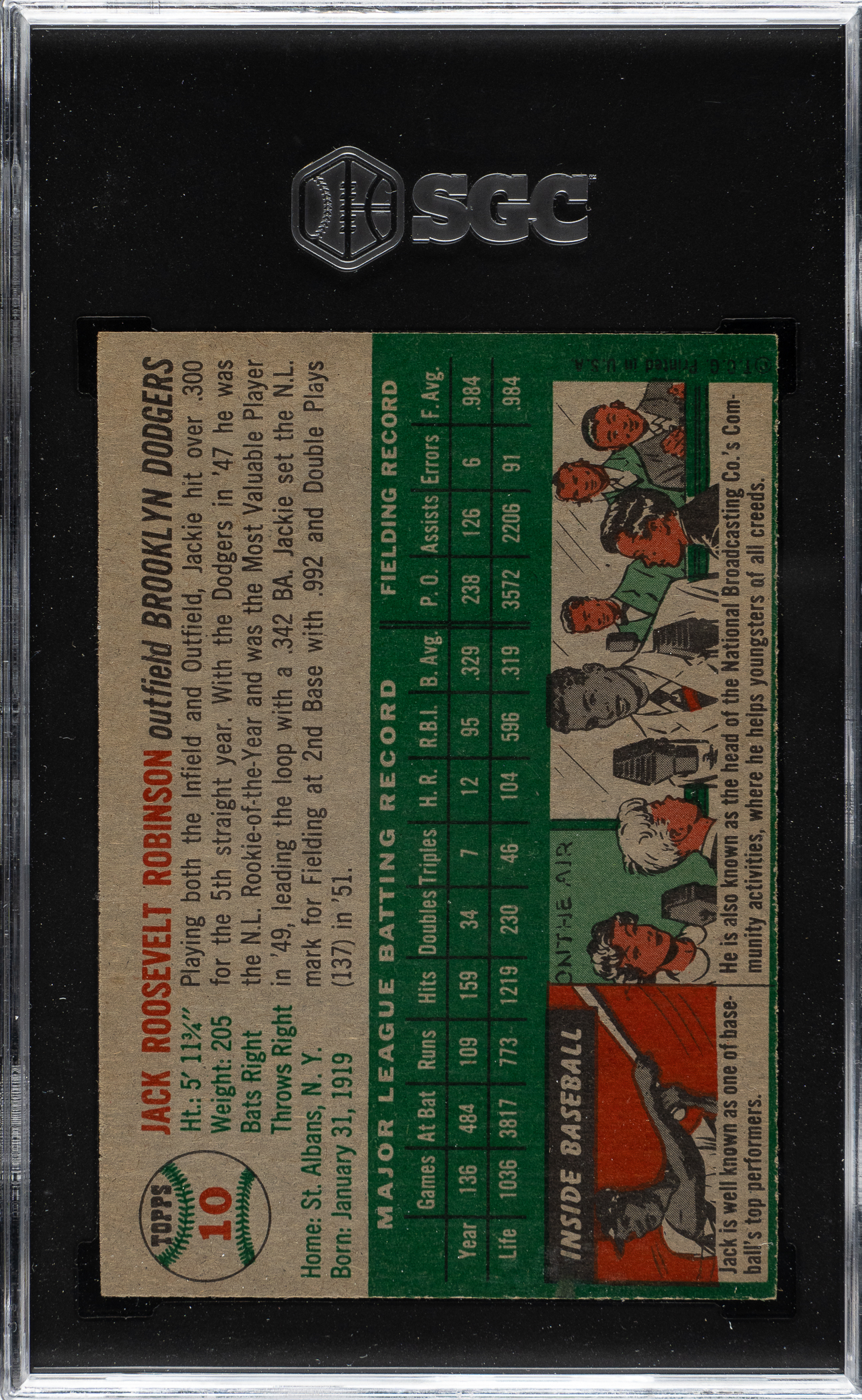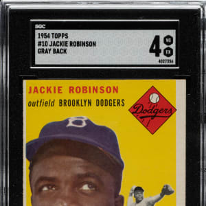Graded VG/EX 4 by SGC. Rarely offered example of card #10 Jackie Robinson from the 1954 Topps "Canadian" gray-back series. Cards #1-50 within the 250-card 1954 Topps set are most commonly found printed on white-colored stock. This abbreviated set printed on gray stock was produced for issue solely in Canada that year. This classic card of Robinson is one of the key cards to the set. The offered example is bright and crisp, with bold colors, light wear on the corners, and centering toward the far left. The “gray-back” reverse is entirely clean. An extremely attractive example of one of the key Hall of Famers in the series that will be of great interest to 1954 Topps master set collectors as well as advanced Topps card enthusiasts.