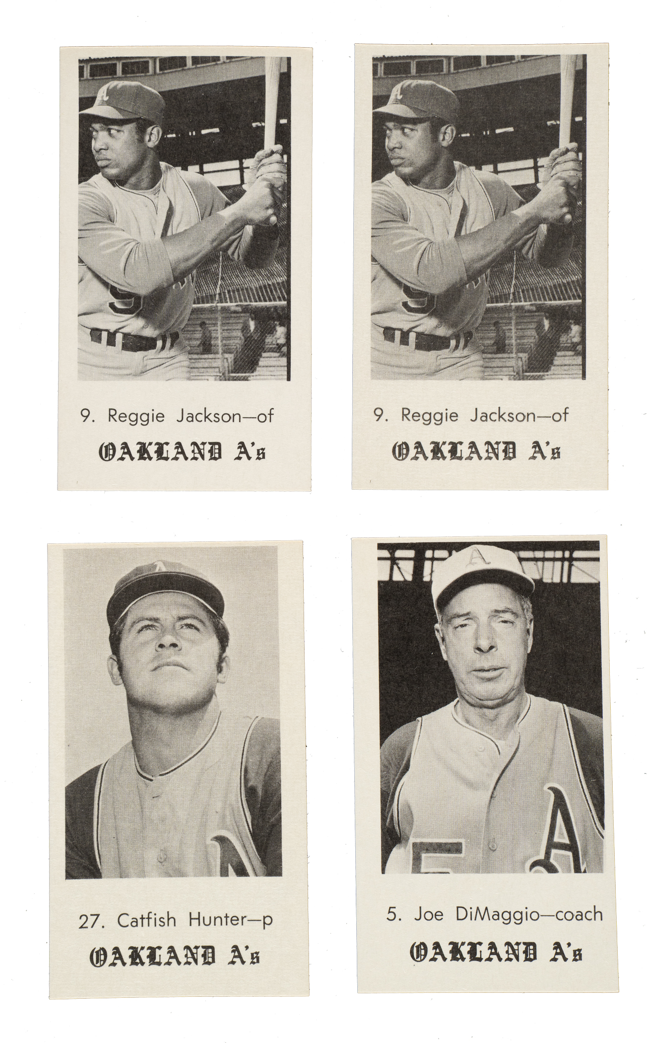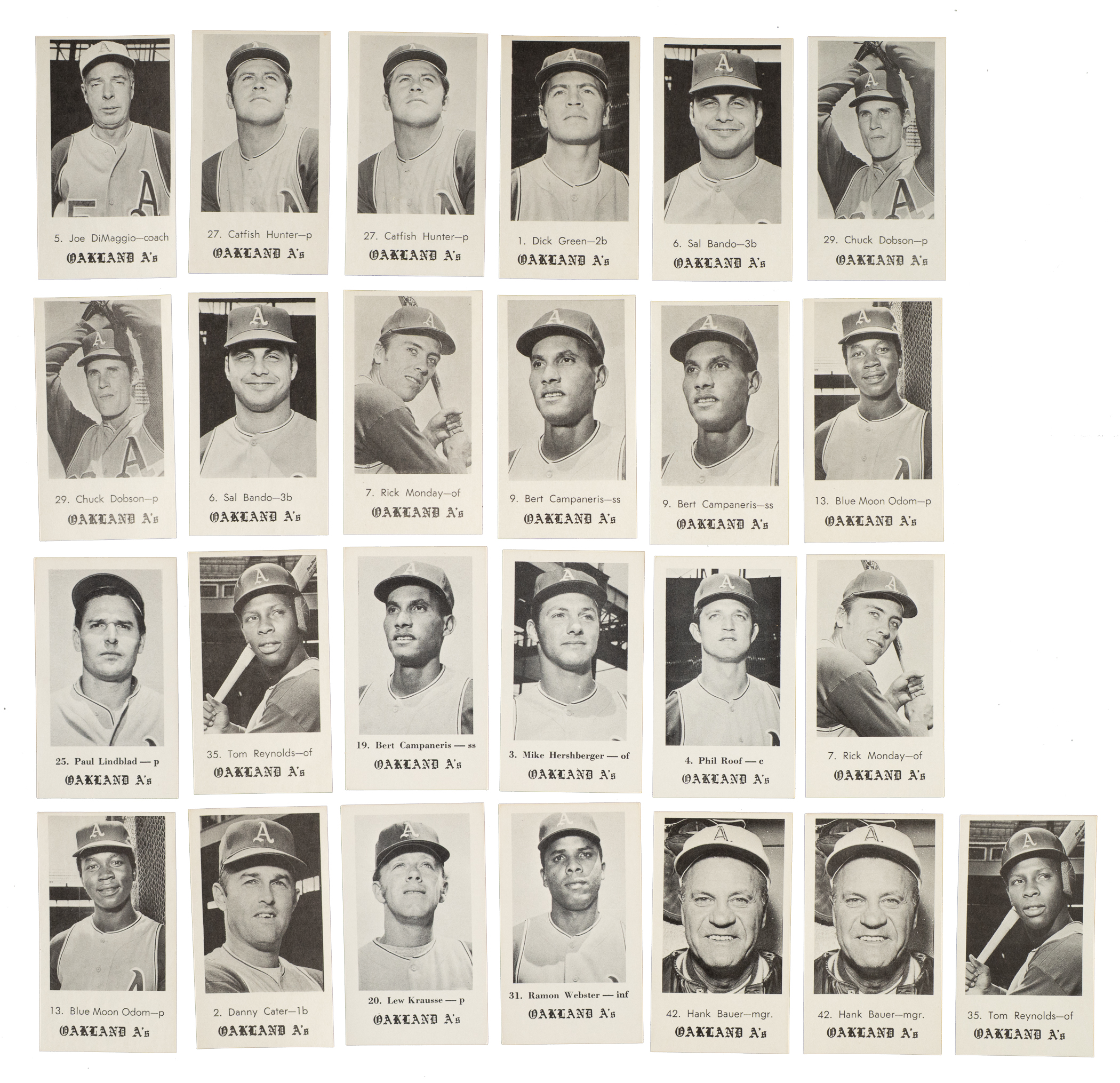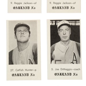 Presented is a near-complete set of 1969 Jack in the Box Oakland Athletics consisting of eighteen different cards (out of twenty-one in the set). This collection includes eleven duplicates and is highlighted by Catfish Hunter (3), Joe DiMaggio (2), and Reggie Jackson (2)! Missing the following three cards for completion: #17 Pagliaroni, 24 Nossek, and 30 Nash. Condition ranges from Ex to Nr/Mt-Mt (averaging Ex-Mt), with a couple slightly lesser. This set consists of the following: #1, 2, 3, 4, two 5 DiMaggio (both Ex due to centering), two 6, two 7, two 9 Campaneris, two 9 Jackson (Nr/Mt-Mt and Nr/Mt), two 13, 19 Campaneris, 20, 25, two 29, 31, two 35, three 27 Hunter (two Ex-Mt and Ex), and two 42 Bauer. Total: 29 cards (near set of 18 plus 11 duplicates).