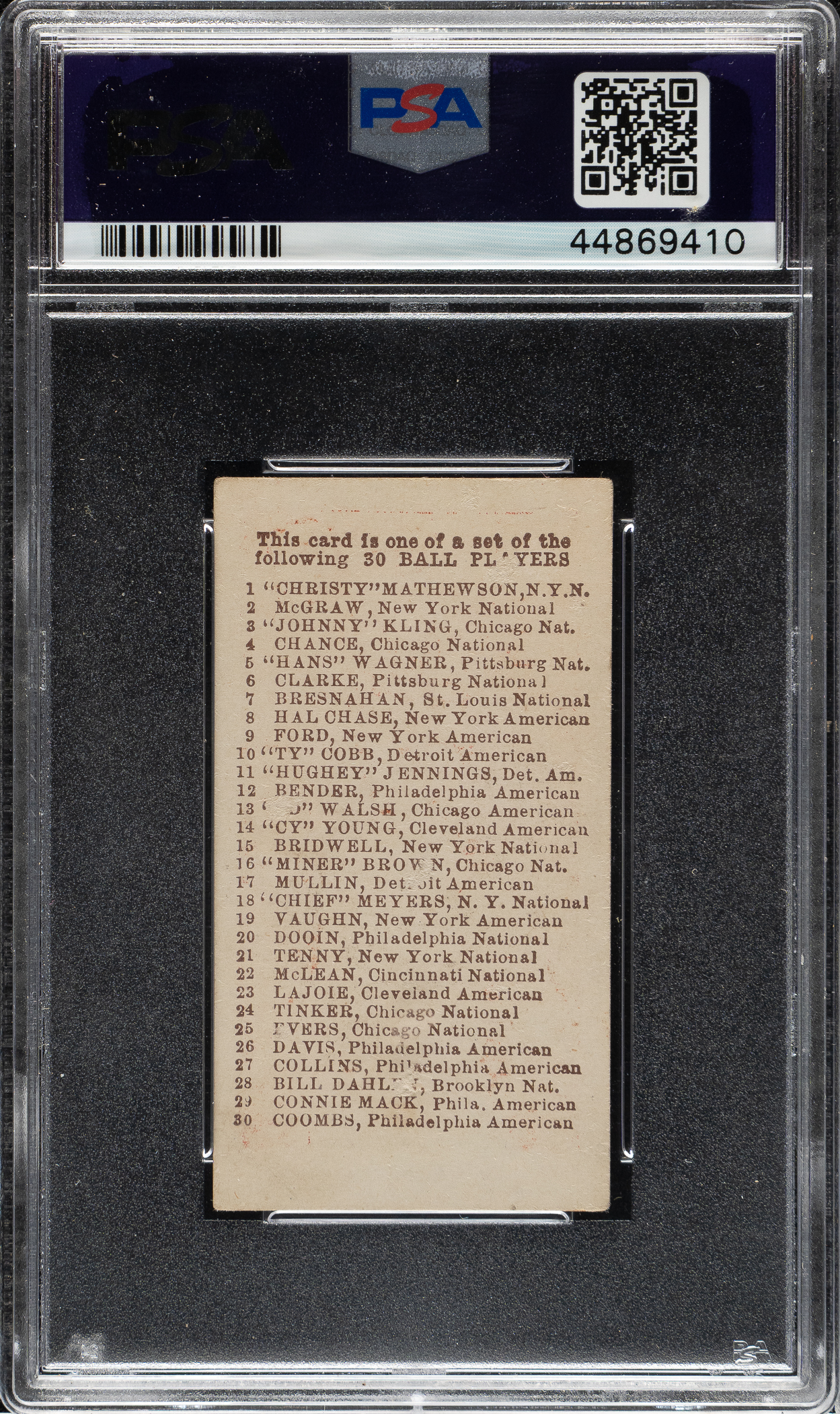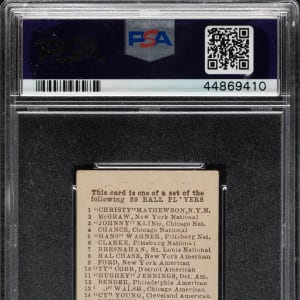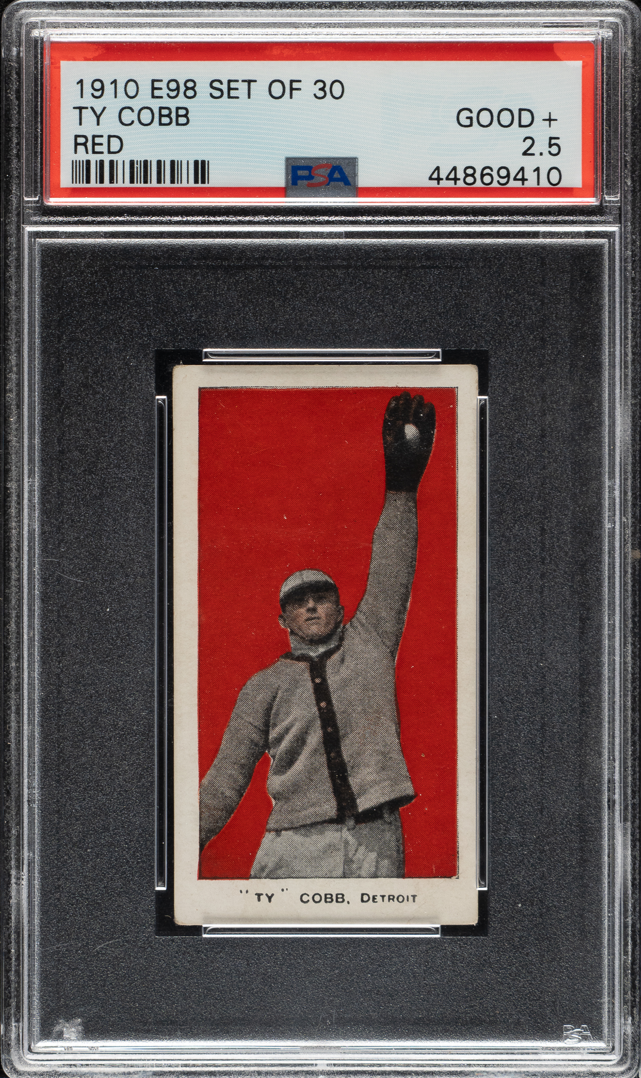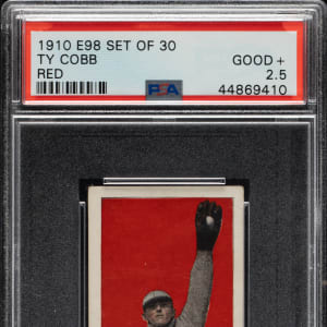 Graded GOOD+ 2.5 by PSA. Very attractive example of Detroit Tigers Hall of Famer Ty Cobb from the E98 “Set of 30” candy-card issue. The manufacturer of E98 is unknown, and the set may easily be confused with other caramel-card sets of the era (E93 and E94 specifically). However, this is an entirely different set even though it uses many of the same subjects and poses. For many years, E98s were among the scarcest of the 1910-era caramel cards, but the “Black Swamp Find” changed the population dramatically. E98s have always been very desirable, and their increased availability and noteworthiness due to the find may have actually increased the demand as more collectors have become familiar with the set. The offered card features a brilliant red background, impressive registration, and even corner wear. The checklist reverse is boldly printed. Downgraded due to a small, unobtrusive crease in the bottom right and a few tiny spots of paper loss on the reverse. Caramel cards in general are much rarer than tobacco cards of the era. Because they were issued with caramels, one card per package, and sold to children (as opposed to being sold to adults with tobacco), they also tend to survive in a much lower grade. This is a strong example of key Hall of Famer Ty Cobb from this extremely desirable early 20th century candy issue.