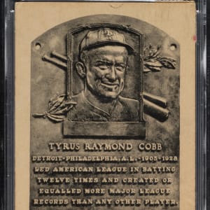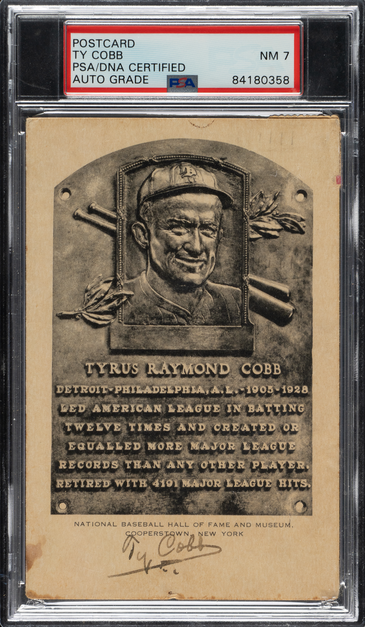 Black-and-white (Artvue Type 1) Hall of Fame postcard of Ty Cobb signed in black ink on the front. PSA/DNA has encapsulated the card and graded the signature NM 7. Cobb, along with Ruth, Wagner, Alexander, and Eddie Collins, is one of the keys to a complete set of autographed black-and-white Hall of Fame postcards. The postcard (3.5 x 5.5 inches), which has been mailed and postmarked, displays a few spots of staining and a patch of paper loss on the reverse. Fair condition overall.
