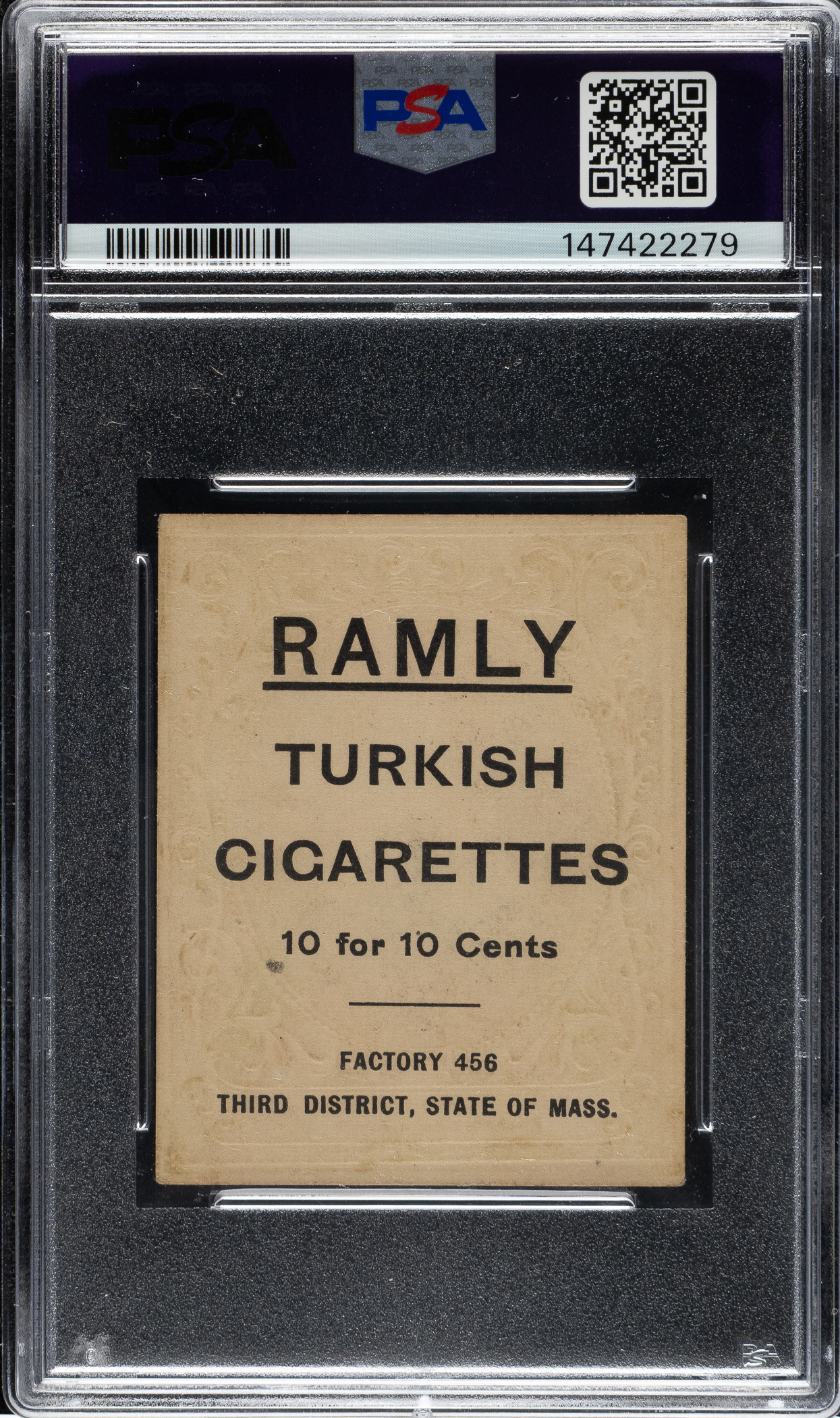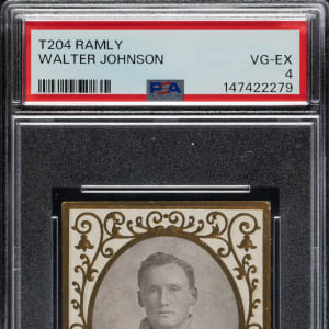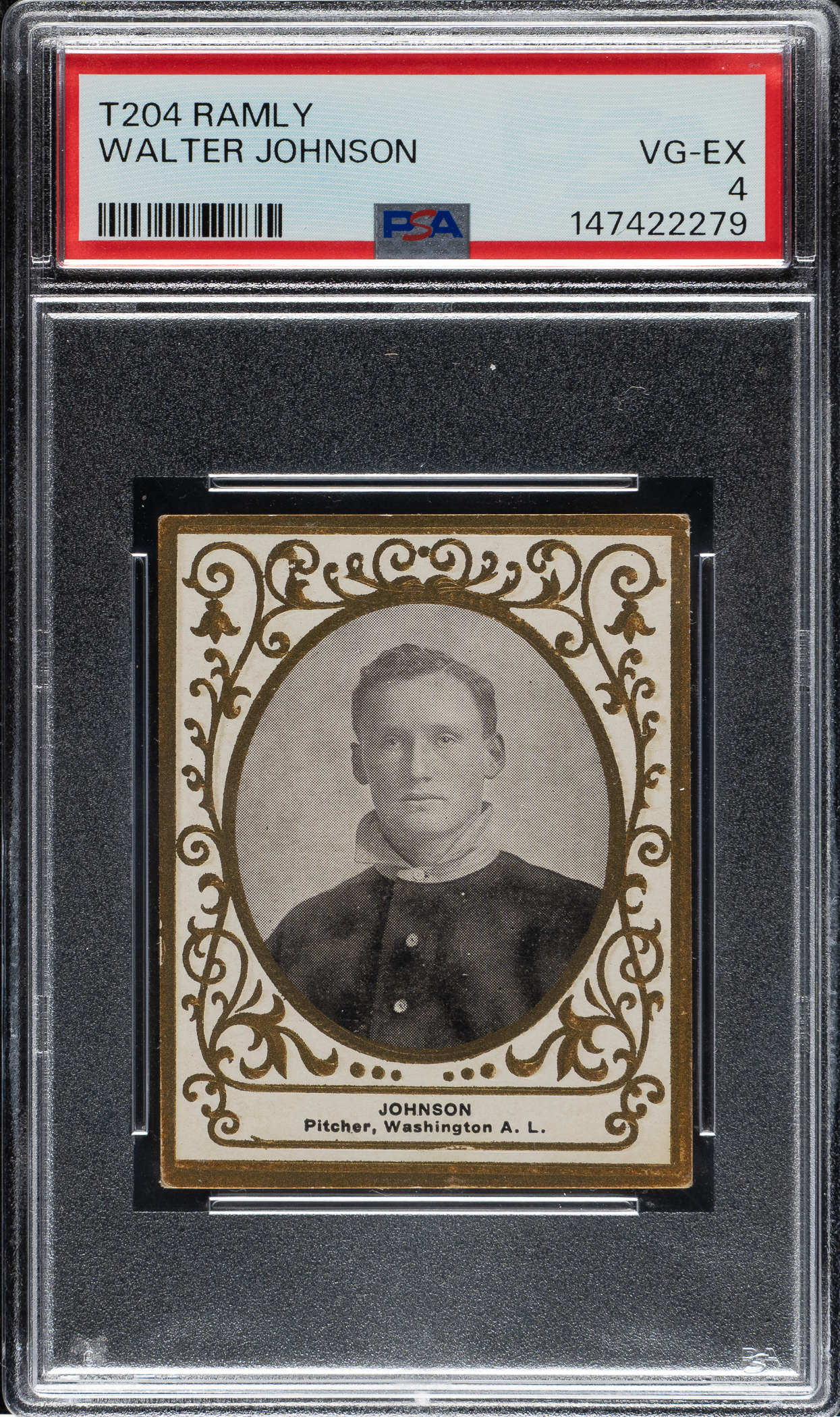 Graded VG-EX 4 by PSA (submitted by REA). Outstanding, newly-discovered example of Hall of Famer Walter Johnson (Washington Senators) from the T204 Ramly set, one of the most popular of all 1910-era tobacco issues. This card is part of an exciting, fresh-to-the-hobby find of T204 Ramly cards that were saved by the family of the original owner who lived in the New England area, all consigned to REA's Spring 2026 and future auctions. This is one of tobacco-card collecting's classics. One of Johnson's rarest cards, it is also the key card from the Ramly Tobacco set. Ramlys, which are highly prized among collectors for their distinctive style and rarity, are among the most condition-sensitive sets in existence, with fragile gold borders easily susceptible to chipping. The offered example has a striking portrait image, minimal chipping to the gold borders, and even corner wear. The reverse is clean with bold black print. This is an exceptionally attractive example, offered in a much higher grade than normally encountered, of the key card from one of tobacco-card collecting's most highly respected and beautifully designed sets. This card would be a significant highlight in a world-class T204 Ramly, Walter Johnson, or classic-card collection.