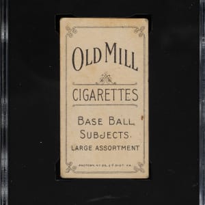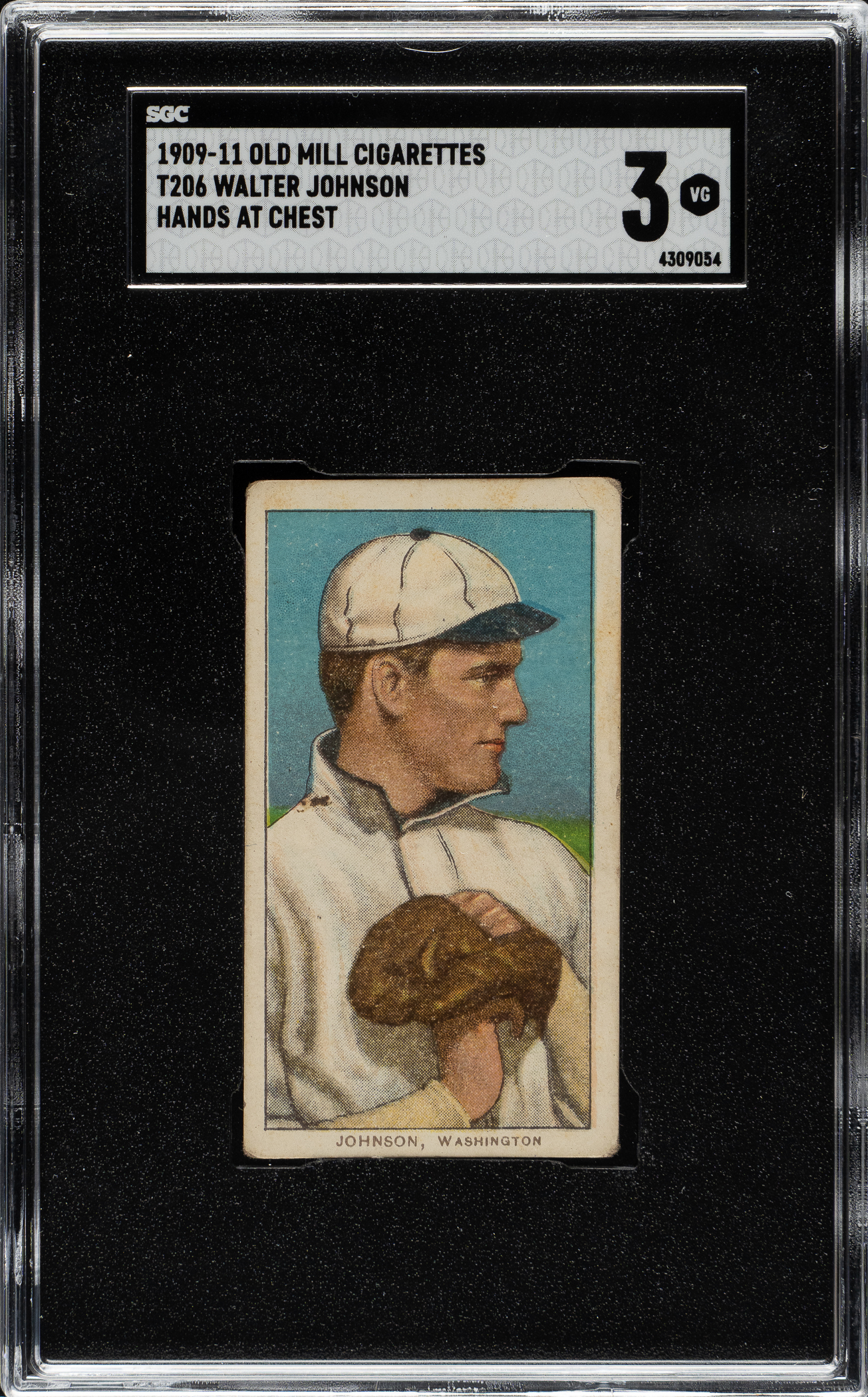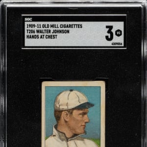 Graded VG 3 by SGC. Mid-grade T206 of Washington Senators Hall of Fame pitcher Walter Johnson featuring a desirable Old Mill advertising reverse. Johnson is one of the key Hall of Famers in the T206 White Borders set. This example has vibrant colors, outstanding registration, and moderate corner wear (small crease below top right). The advertising reverse is boldly printed and mostly clean.