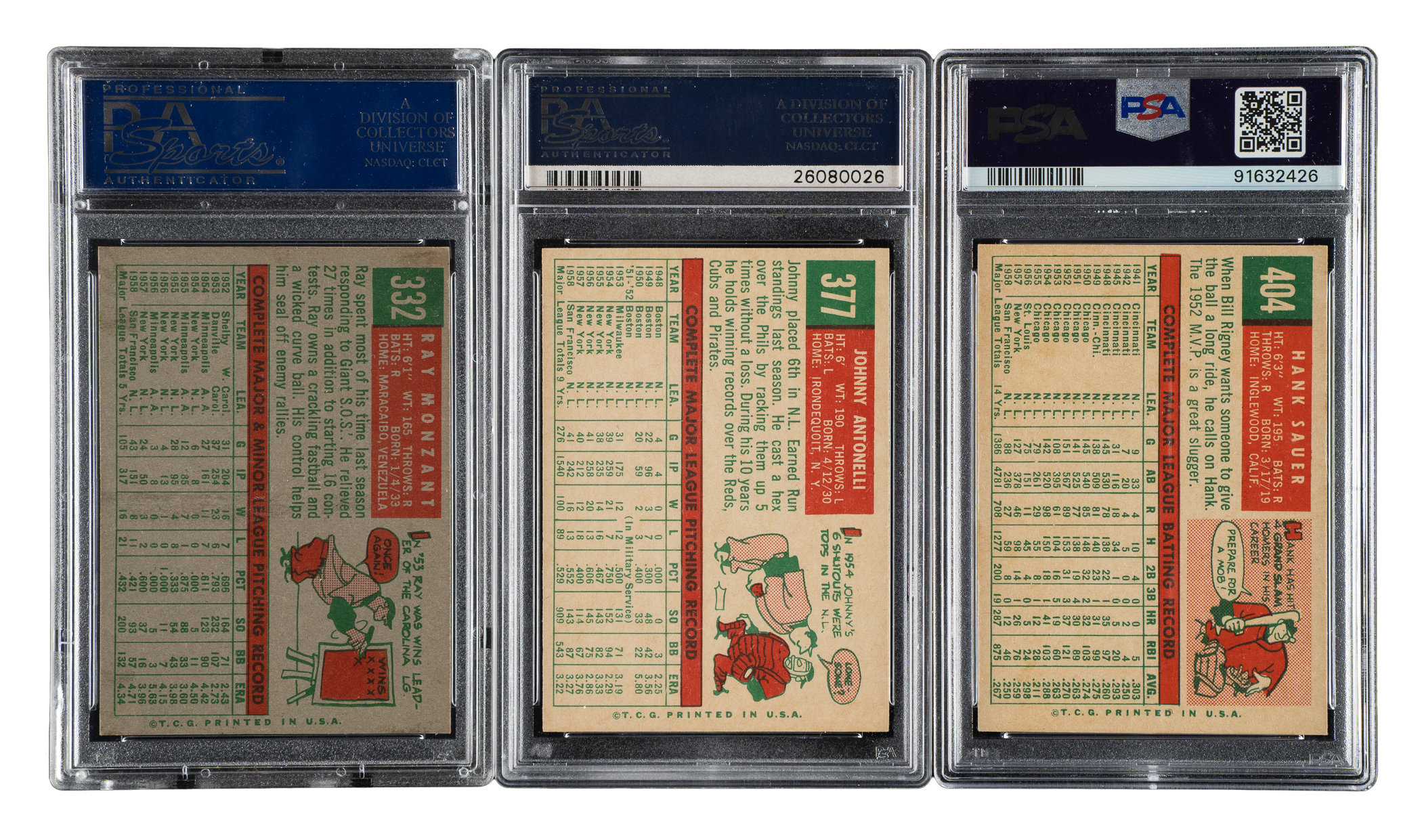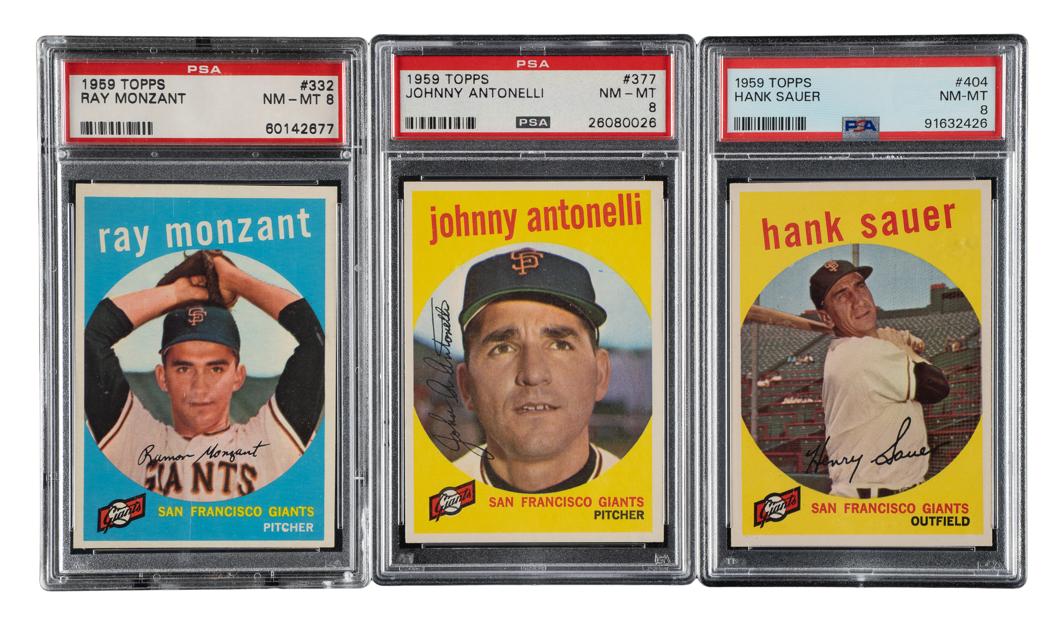 Lot # 1966: 1959 Topps PSA NM-MT 8 Trio: Ray Monzant, Johnny Antonelli, and Hank Sauer