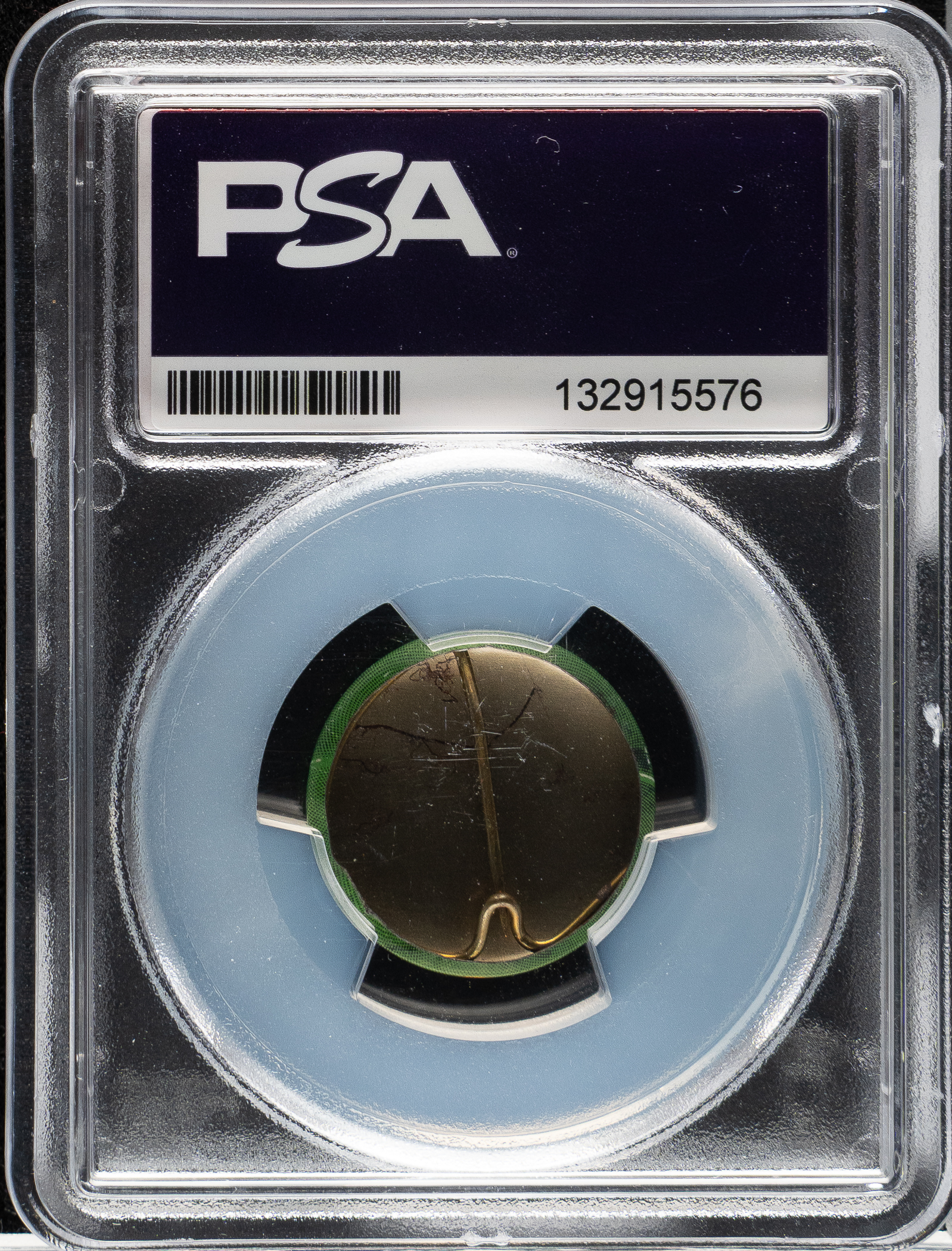 Graded EX 5 by PSA (submitted by REA). Attractive mid-grade example of Mickey Mantle from the very popular PM15 "Yellow Basepath" pin set. Issued in 1956, these pins were dispensed by bubble-gum machines in five-and-dime stores and at supermarkets. Mantle is the key to this 32-pin set. High-grade examples of these pins are rare because like all litho pins (as opposed to celluloid pins), they are extremely condition-sensitive. Litho pins are very susceptible to scratches because their designs are printed directly onto the metal, as opposed to being printed on paper and encased under protective celluloid, as is the case with celluloid pinbacks. The pin displays a number of scratches (common flaw with this set). A rarely offered mid-grade sample of this important Hall of Famer from one of baseball-pinback collecting's revered sets. Diameter: 7/8 inch.