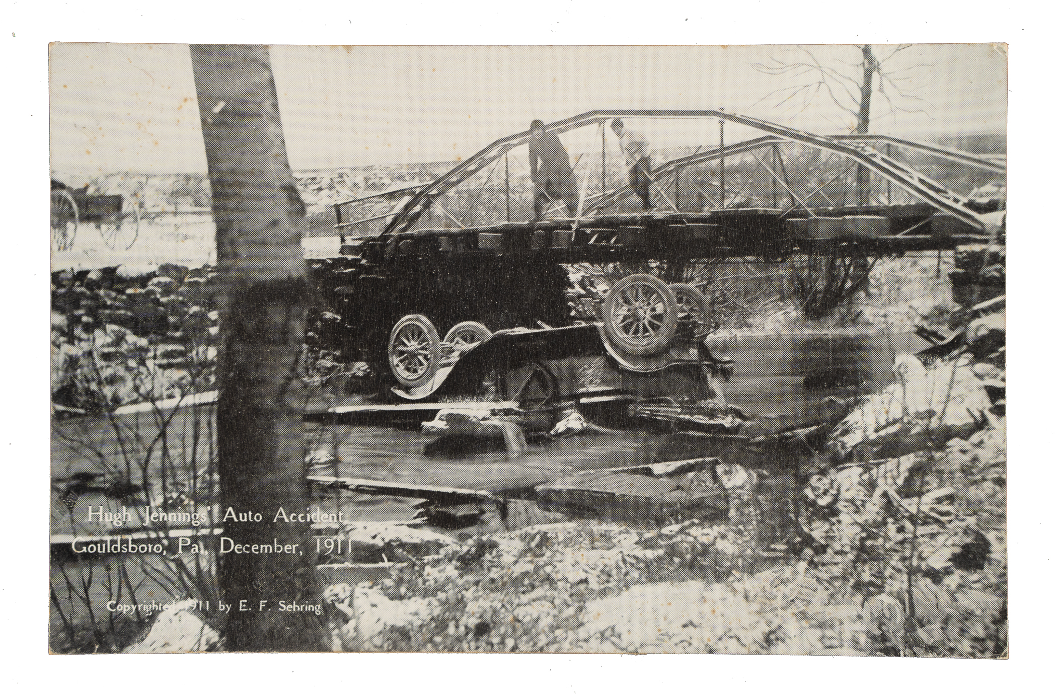 1911 E.F. Sehring postcard depicting Detroit Tigers Hall of Famer Hughie Jennings' Auto Accident in Gouldsboro, PA, December, 1911. A small penciled "473" is visible on the reverse, otherwise Vg-Ex.