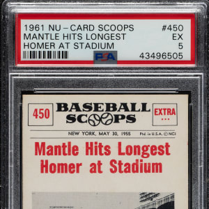 Lot # 1979: 1961 Nu-Card Scoops #450 Mickey Mantle Hits Longest Homer at Stadium PSA EX 5
