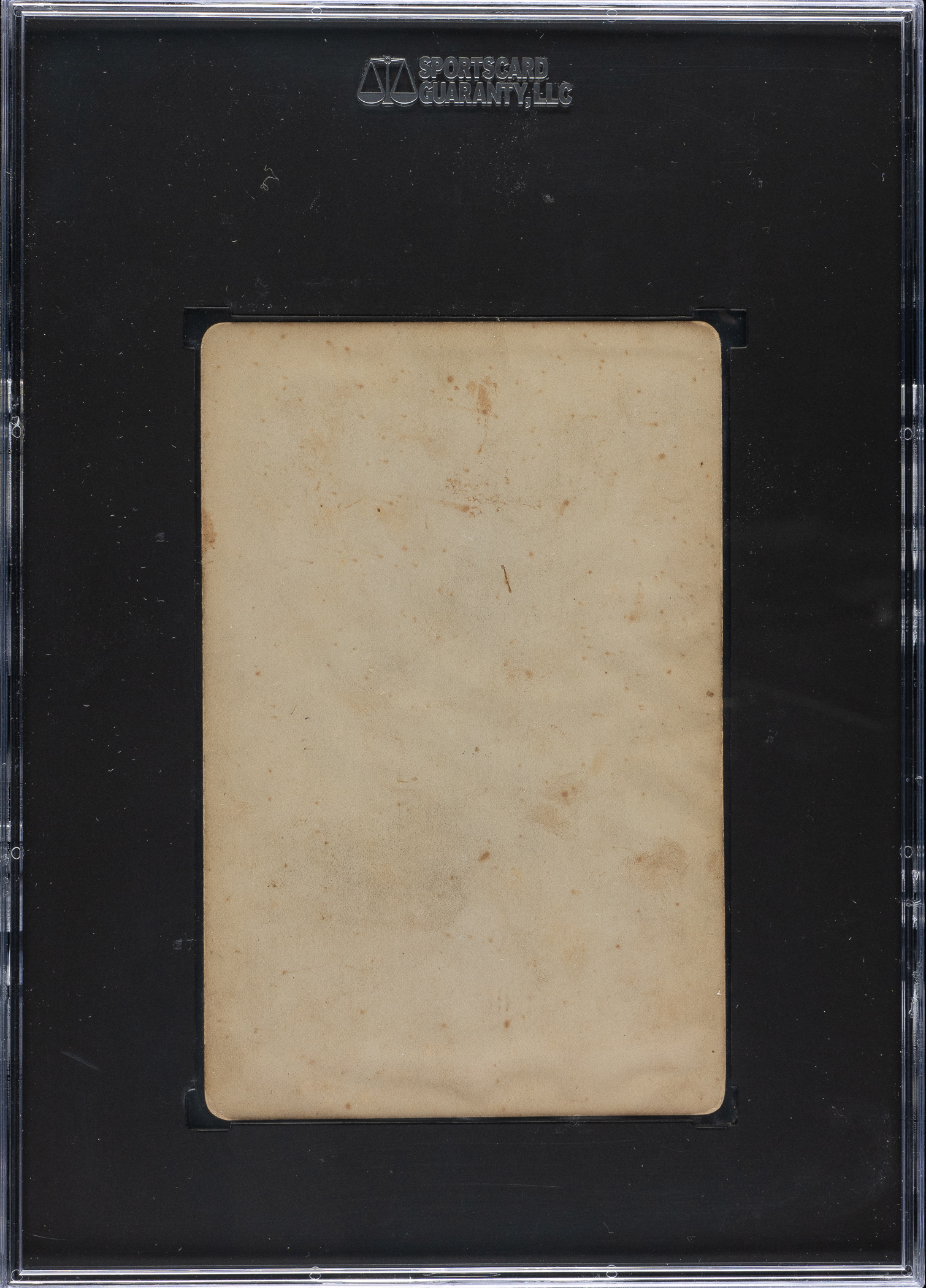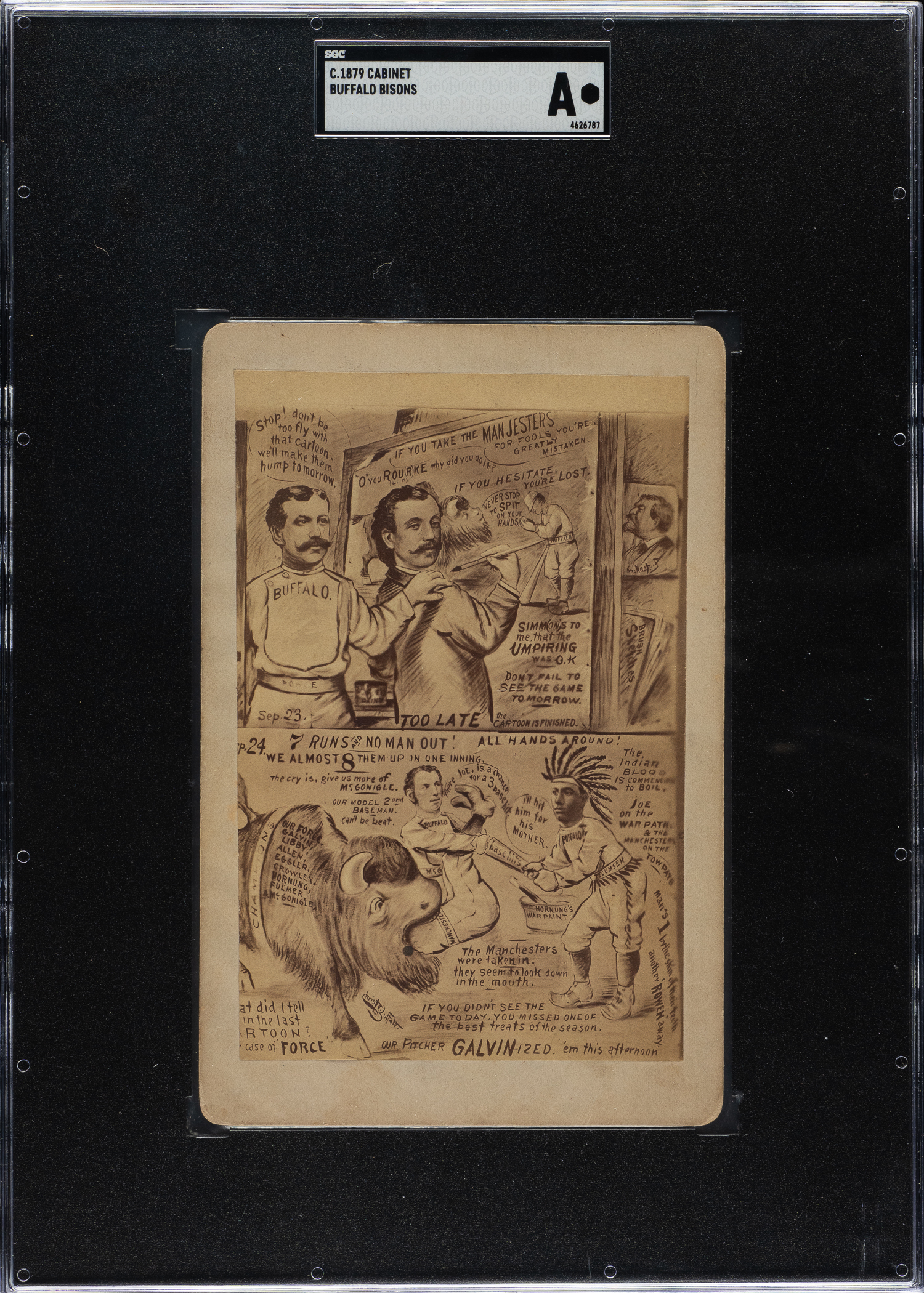 Exceedingly rare and unusual 1879 Buffalo Bisons cabinet card designed with small vignettes relating to the success of two games that Buffalo won during the 1879 season. Led by Hall of Famer Pud Galvin, the Bisons finished third in the National League ahead of Cap Anson’s Chicago White Stockings. Very little has survived relating to the Buffalo Bisons baseball team. This card is one of a series of similarly designed cabinet cards relating to the 1879 Buffalo Bisons, each featuring elaborate and artistic designs and detailed information about the players and games communicated in a comical manner. This is a very attractive example of one of the most interesting and unique cabinet-card sets of the era, produced to commemorate two of the Bisons' most successful games. This unusual and extreme rarity dates from the earliest years of the National League. Encapsulated as Authentic by SGC, the postcard exhibits exceptional clarity and foxing on the reverse.