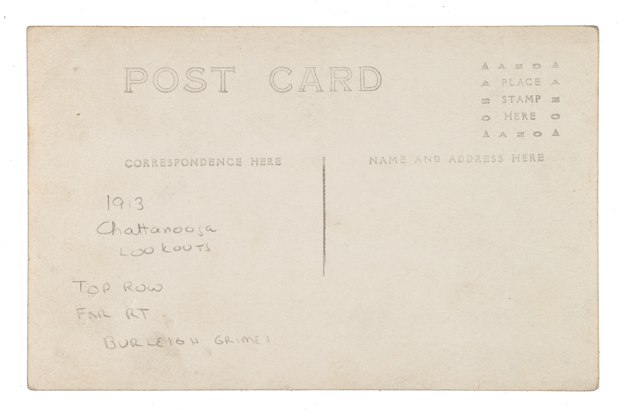 Postcard of 1913 Chattanooga Lookouts Baseball Team with Harry Coveleski, Gabby Street, and Kid Elberfield. Ink writing on front and pencil writing on reverse, otherwise Vg.