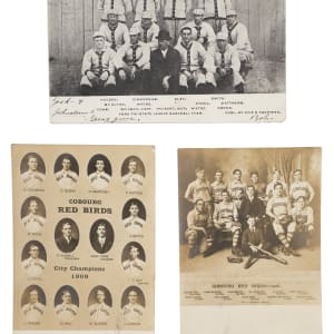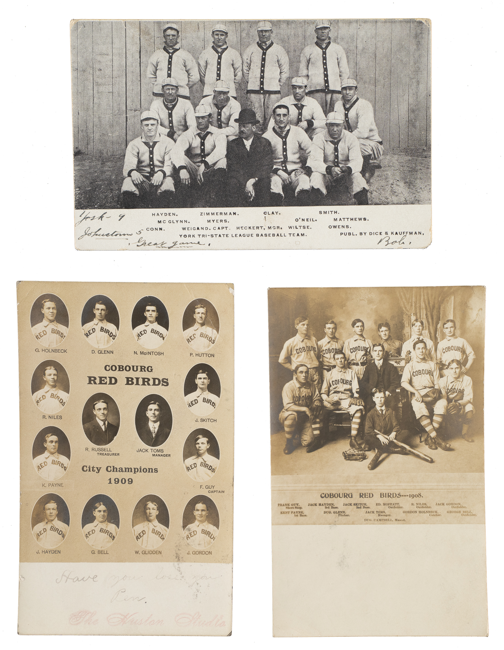 Trio of 1906 to 1908 team postcards. This collection consists of the following: 1906 York/Tri-State League with Jack Hayden (postal use and ink writing on front, otherwise Gd+), 1908 Cobourg Red Birds (Vg), and 1909 Cobourg Red Birds (postal use and pencil writing on front, otherwise Vg). Although a different Jack Hayden was a member of the Cobourg teams, only the 1906 York postcard depicts the Jack Hayden known for his inclusion in the T206 set and for playing both professional football and baseball.
