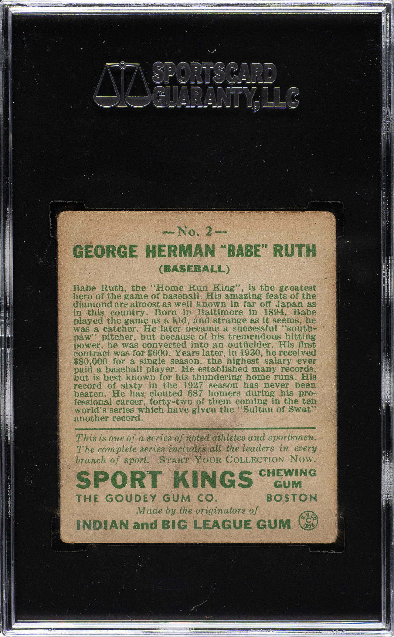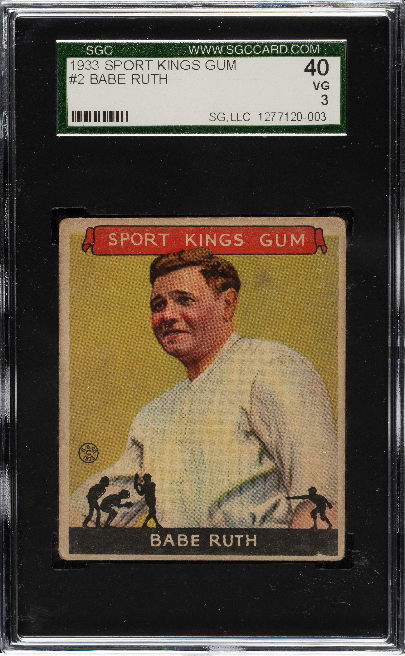 Graded VG 40 by SGC. Mid-grade example of one of the 1930s' most classic cards. The R338 Sport King is one of Ruth's most popular and desirable cards, and one of the most famous and majestic cards in the collecting world. The 1933 Sport Kings Ruth is also far rarer than Ruth's 1933 Goudey counterparts. The offered example is bold and crisp with moderate corner wear and centering toward the bottom. A light discoloration is visible on the reverse. This is a pleasing example of this classic Babe Ruth card.