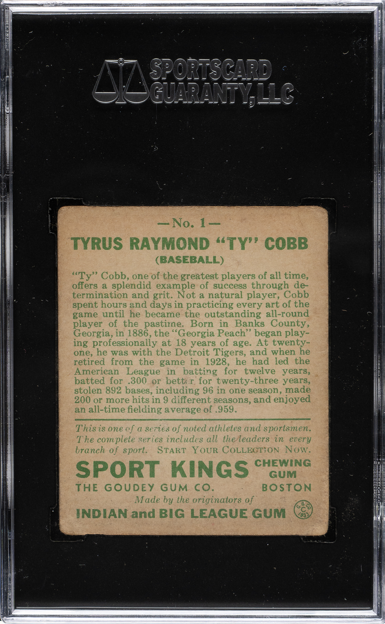 Graded VG 40 by SGC. Mid-grade example of one of Detroit Tigers Hall of Famer Ty Cobb's most sought-after cards. The offered card has a bright yellow background, outstanding registration, and honest corner wear. The reverse is lightly toned with bold green print. The Sport Kings is one of Cobb's most popular and majestic cards. Being the No. 1 card in the set, this card gravitated to the top of a stack, exposing it to extra wear and handling, making high-grade examples even more difficult to find than most other Sport Kings and other Cobb cards. This is a very appealing example of one of Cobb's classic cards.