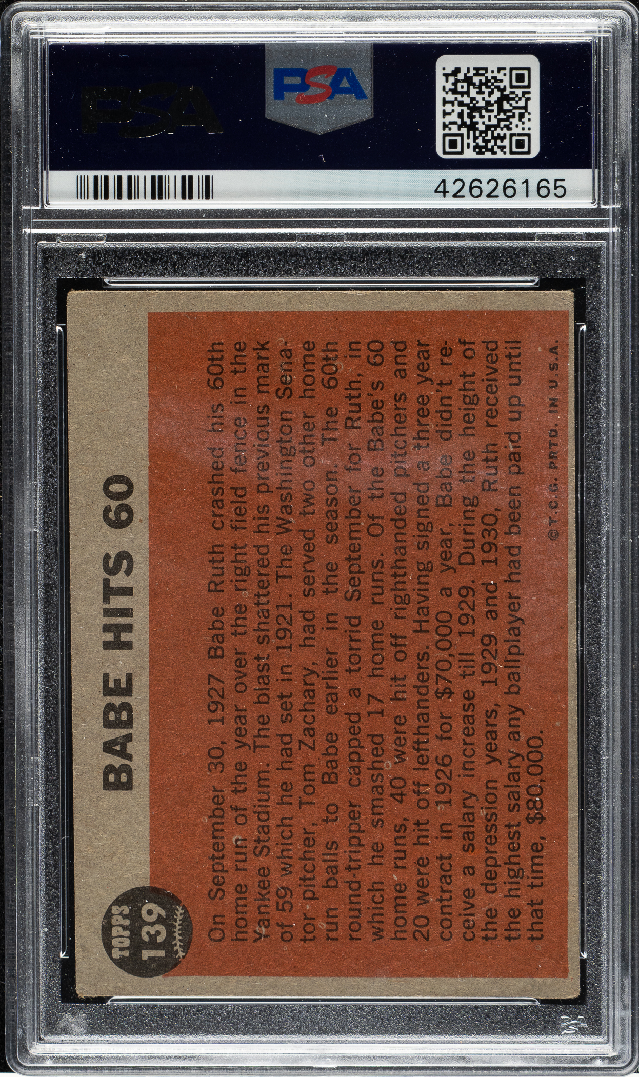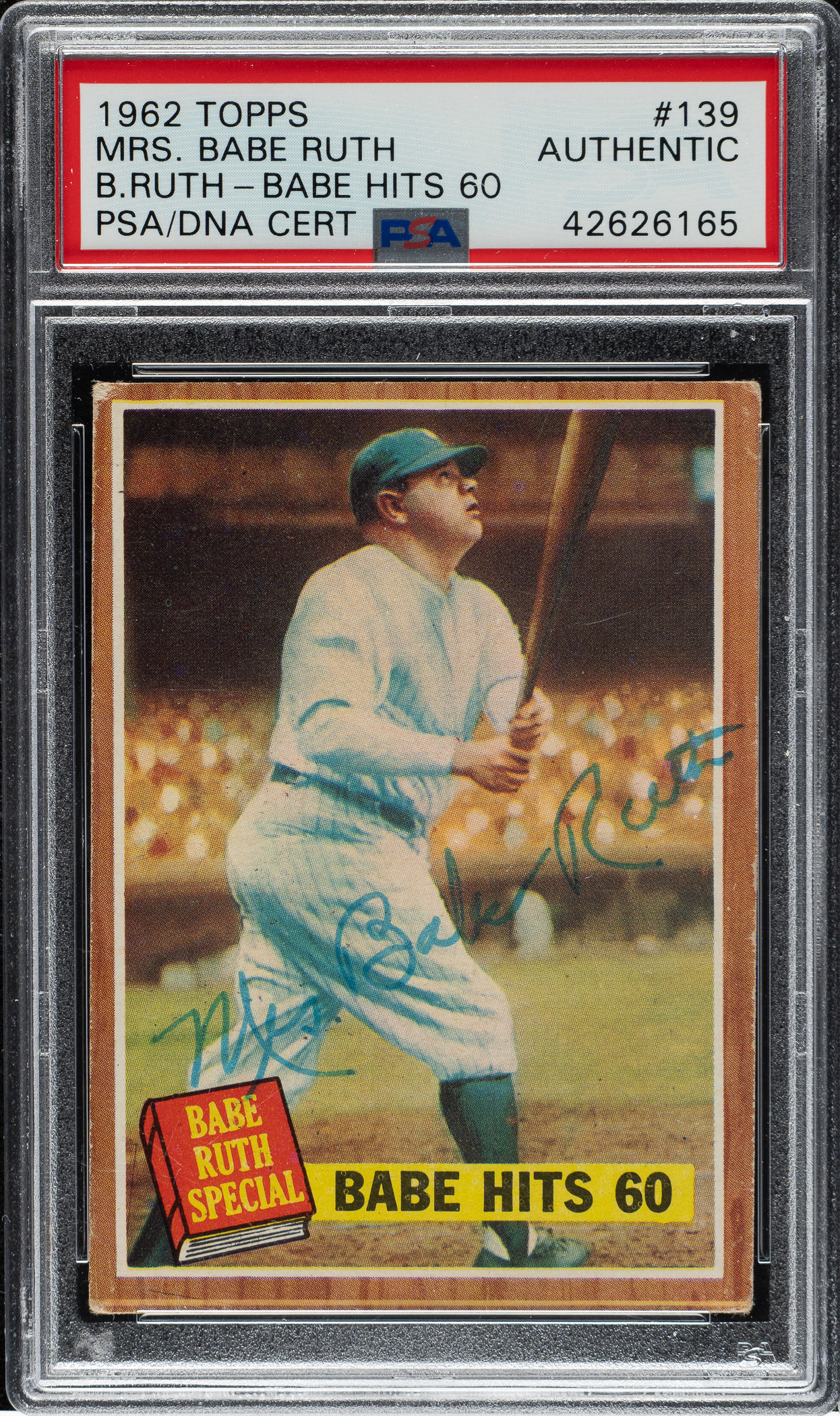1962 Topps card #139 of Babe Ruth signed by his widow, Claire. The blue ink inscription reads "Mrs. Babe Ruth." PSA/DNA has encapsulated the item and certified both the card and signature as "Authentic."