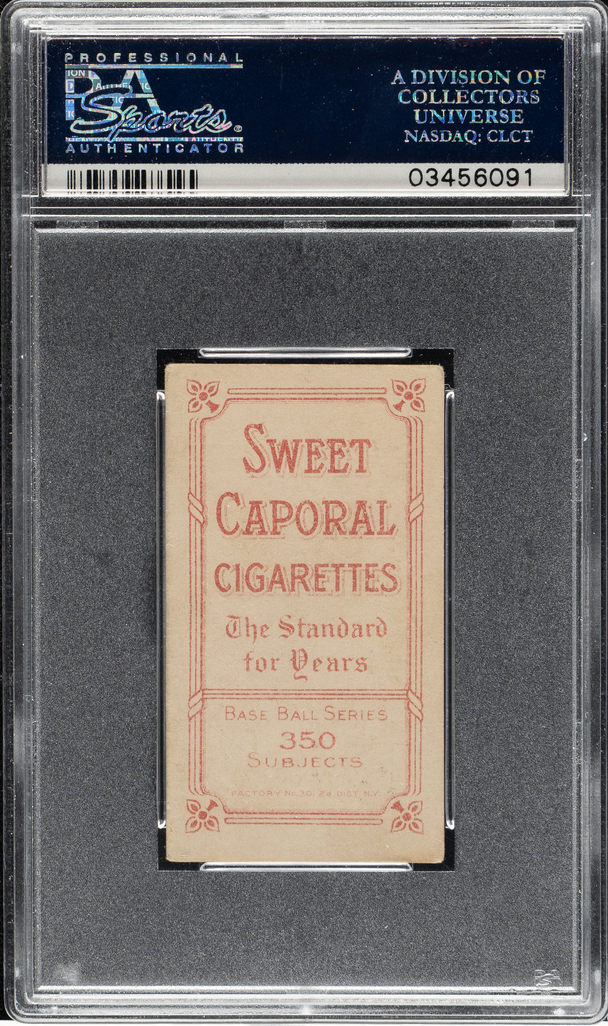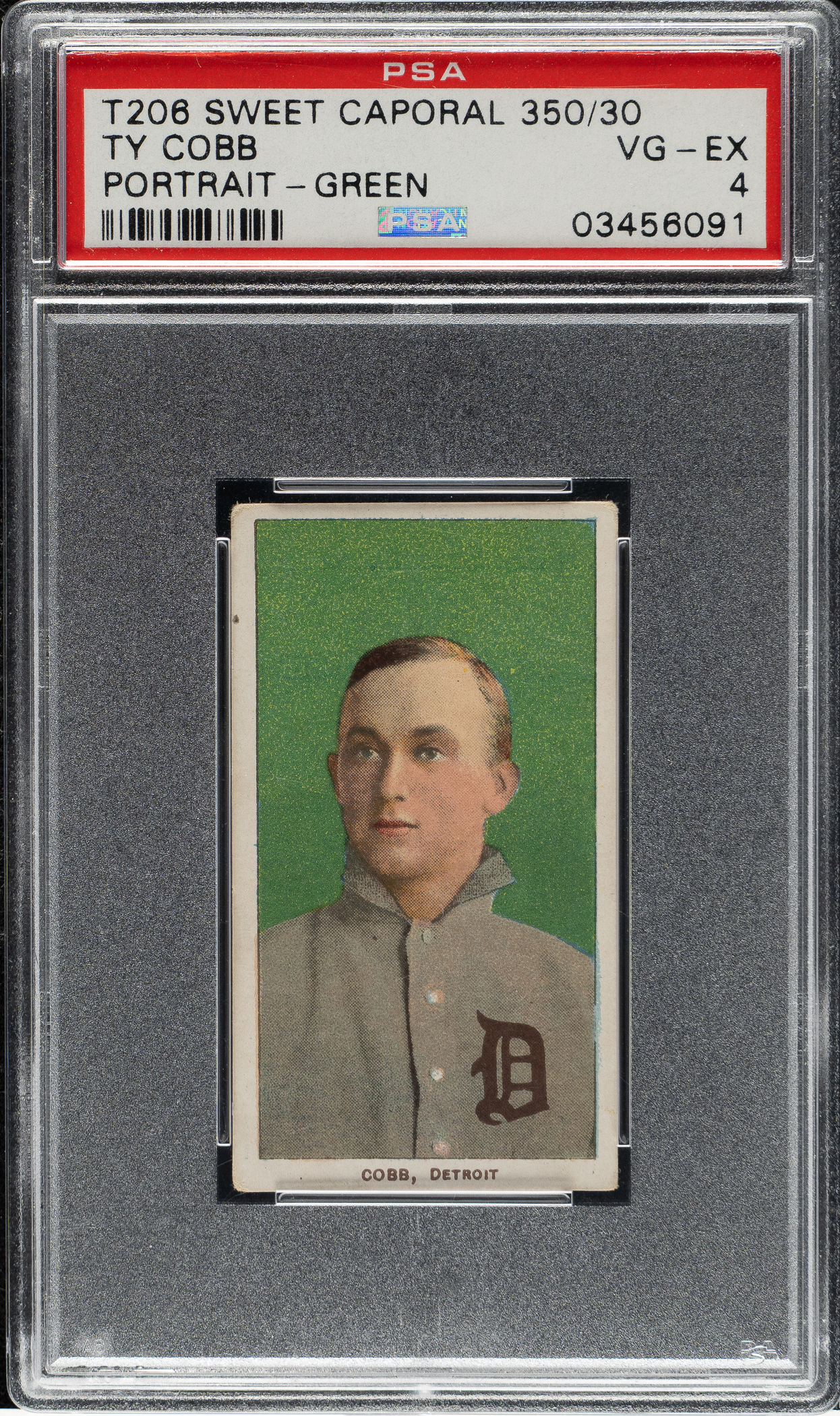 Graded VG-EX 4 by PSA. Mid-grade example of this classic tobacco card of Detroit Tigers Hall of Famer Ty Cobb. The green background pose is considered the rarest of the four poses of Cobb in the T206 set. The offered example has vibrant colors, a crisp image, even corner wear, and a tiny black mark on the left edge. Sweet Caporal 350/30 advertising reverse. A solid mid-grade example of one Cobb's most popular cards.