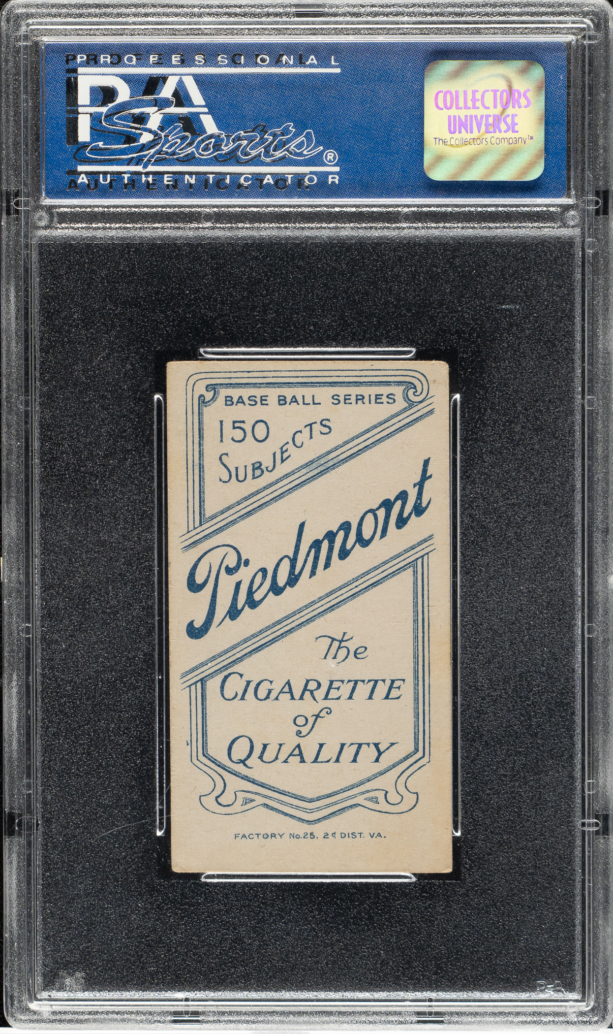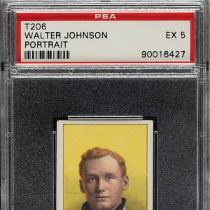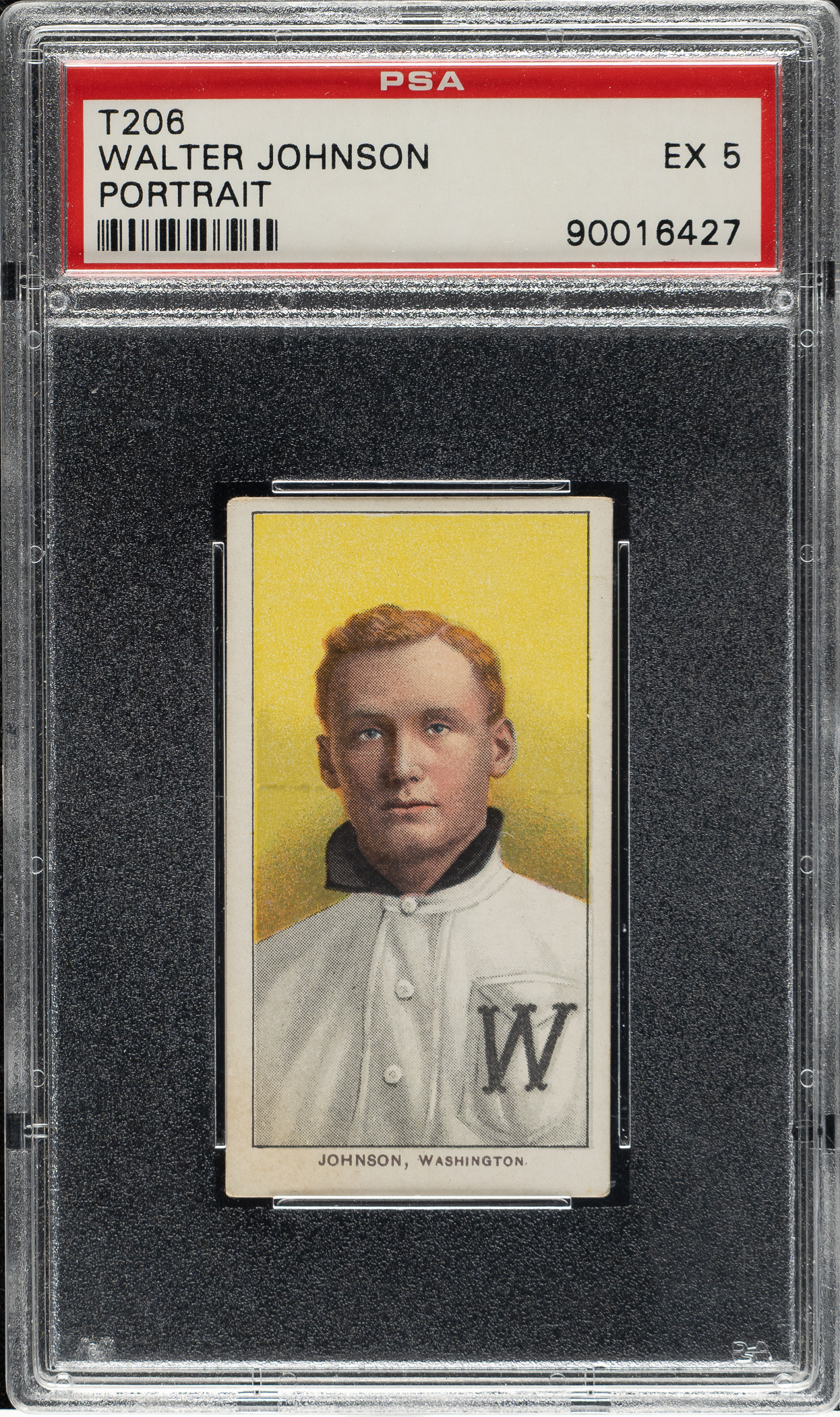 Graded EX 5 by PSA. Mid-grade example of Washington Senators Hall of Famer Walter Johnson (portrait) from the classic T206 White Border set. This card has a bright yellow background, a crisp image, and even corner wear. Piedmont 150/25 advertising reverse is boldly printed. This is an attractive card in an extremely desirable grade.