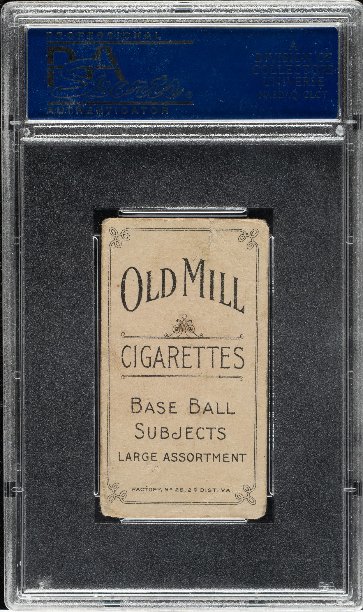 Rarely offered example of this iconic tobacco card of Detroit Tigers Hall of Famer Ty Cobb featuring a desirable Old Mill advertising back. The T206 Ty Cobb bat-off-shoulder pose is one of the key cards in the set. Graded POOR 1 by PSA, the card displays moderate corner wear and scattered creasing. There is also a small tear along the top edge. The important advertising reverse is boldly printed. Despite the condition flaws, this remains a pleasing example.