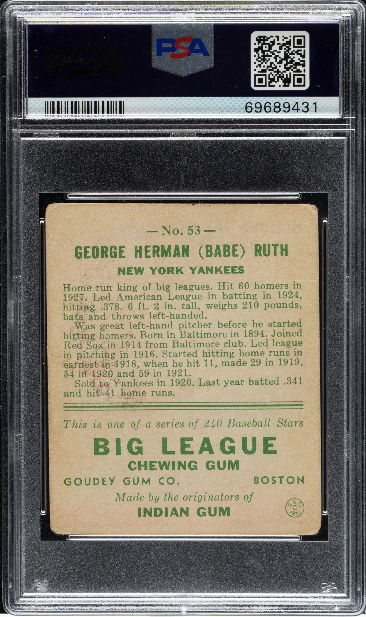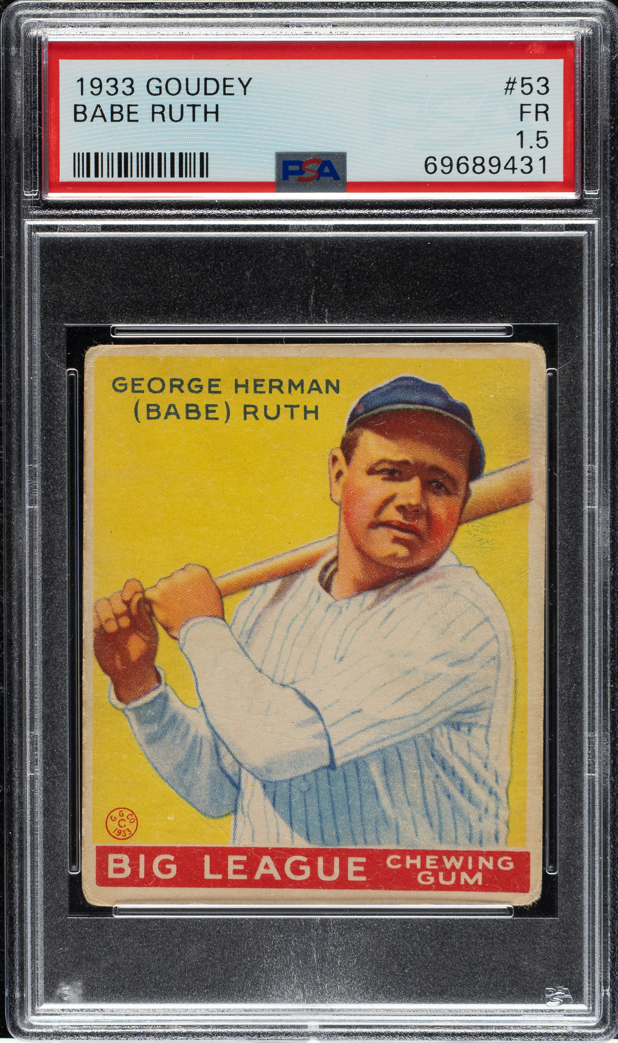 Graded FAIR 1.5 by PSA. Modestly graded example of one of Babe Ruth’s classic cards: #53, yellow background, from the 1933 Goudey series. The "yellow background" pose of Babe Ruth is, without a doubt, his most difficult to obtain and the most sought-after card in the 1933 Goudey set. This example has a bright yellow background, a well-focused image, and honest corner wear. Clean reverse with bold green text. Creasing extending across the lower portion of the card contributes to the assigned grade. This is a very pleasing example of one of Babe Ruth's classic cards from the popular 1933 Goudey Gum series.