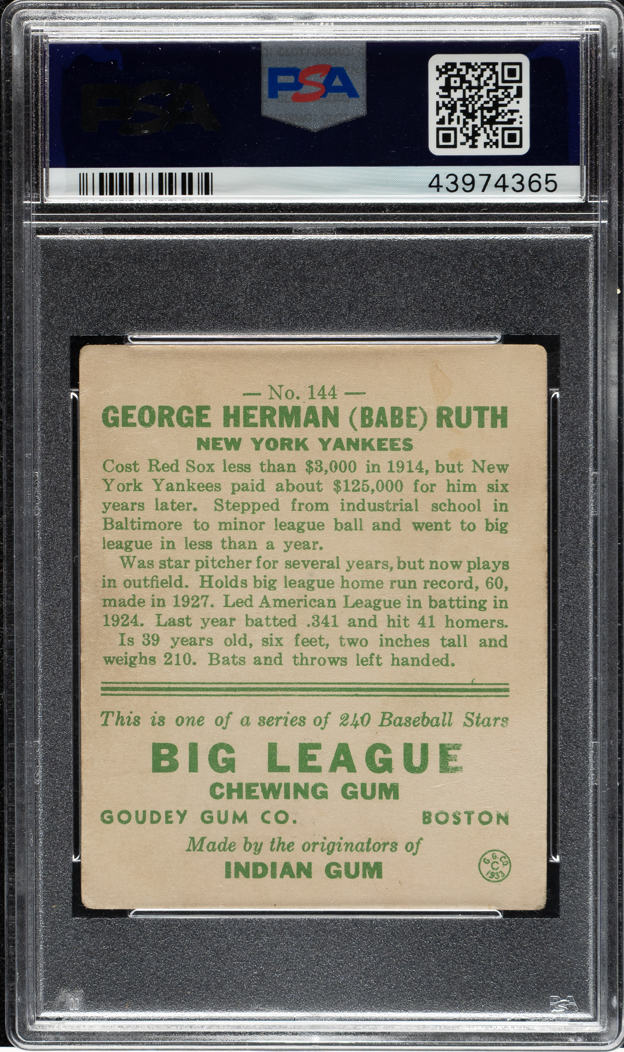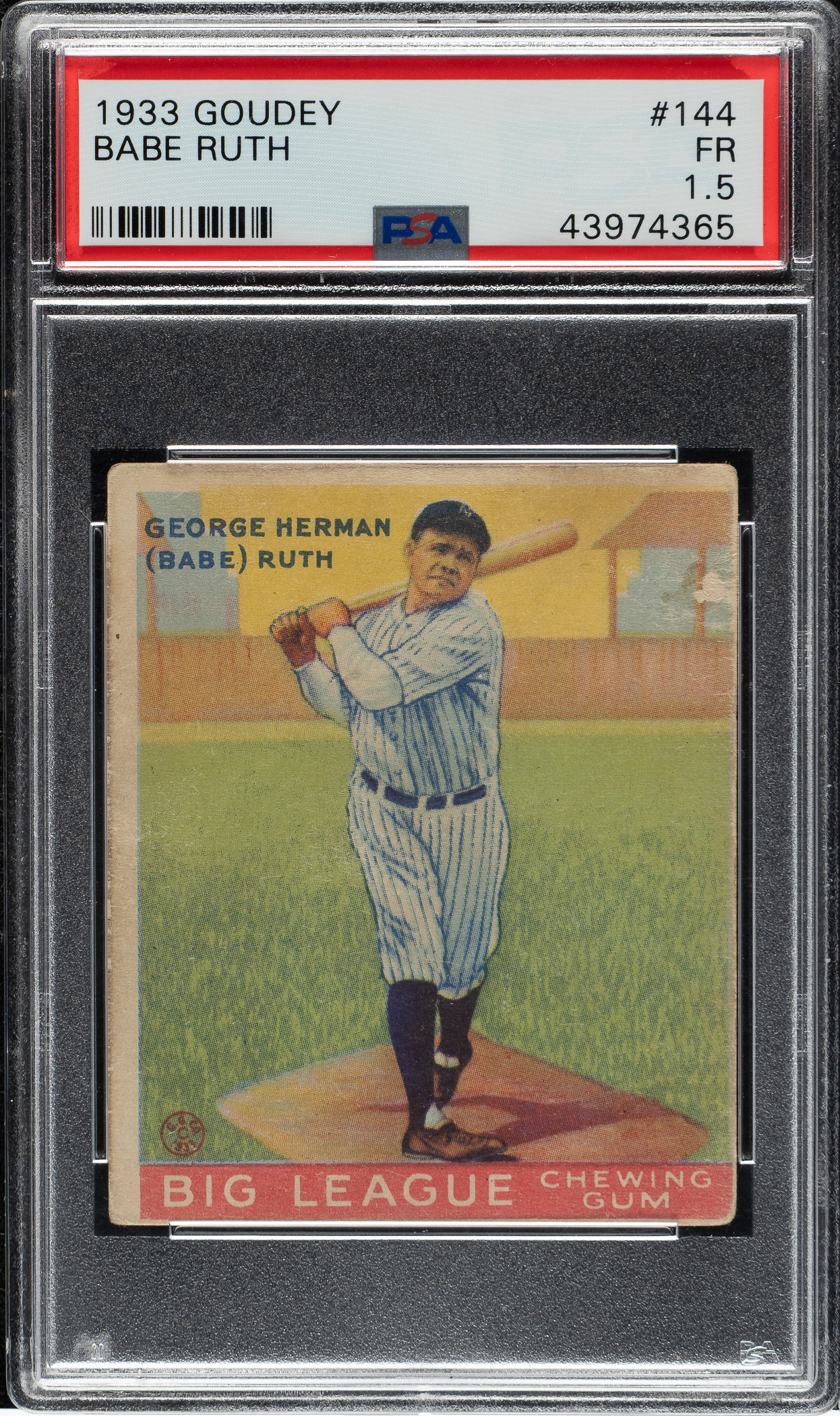Modestly graded example featuring New York Yankees Hall of Famer Babe Ruth in his classic follow-through batting pose. Goudey must have realized what an iconic pose this was because, of all the cards in the set, this is the one it chose to double-print when replacing missing card #106 during production. This continues to be one of Ruth's most popular and recognizable baseball cards. Because of being double-printed (there were exactly twice as many Ruth #144s printed as any other card in the same series), this card also represents the best value among the four Ruth cards in the 1933 Goudey set. The offered card has a bold image of Ruth. Graded FAIR 1.5 by PSA due to moderate corner wear, a small spot of paper loss on the right edge, and centering towards the extreme bottom right. An excellent opportunity to acquire one of Babe Ruth's classic cards from the popular 1933 Goudey Gum series and one of card-collecting's most iconic cards.