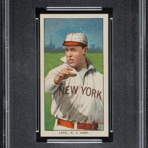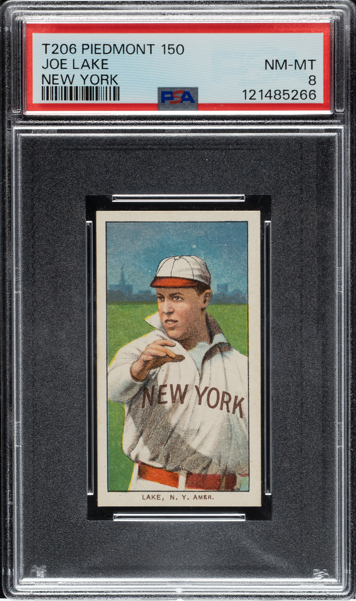 Graded NM-MT 8 by PSA. Only two examples have been graded higher by PSA to date. Outstanding high-grade example of Joe Lake (New York Highlanders). This is a striking card worthy of the finest T206 set in the world. This card has brilliant colors, a crisp image, bright white borders, and strong corners. Clean and boldly printed Piedmont 150/25 advertising reverse. We have found that, at auction, cards from extremely popular sets with low populations in the highest grades can often sell for far more than SMR, and this is especially the case with classic vintage sets such as the T206 White Borders.