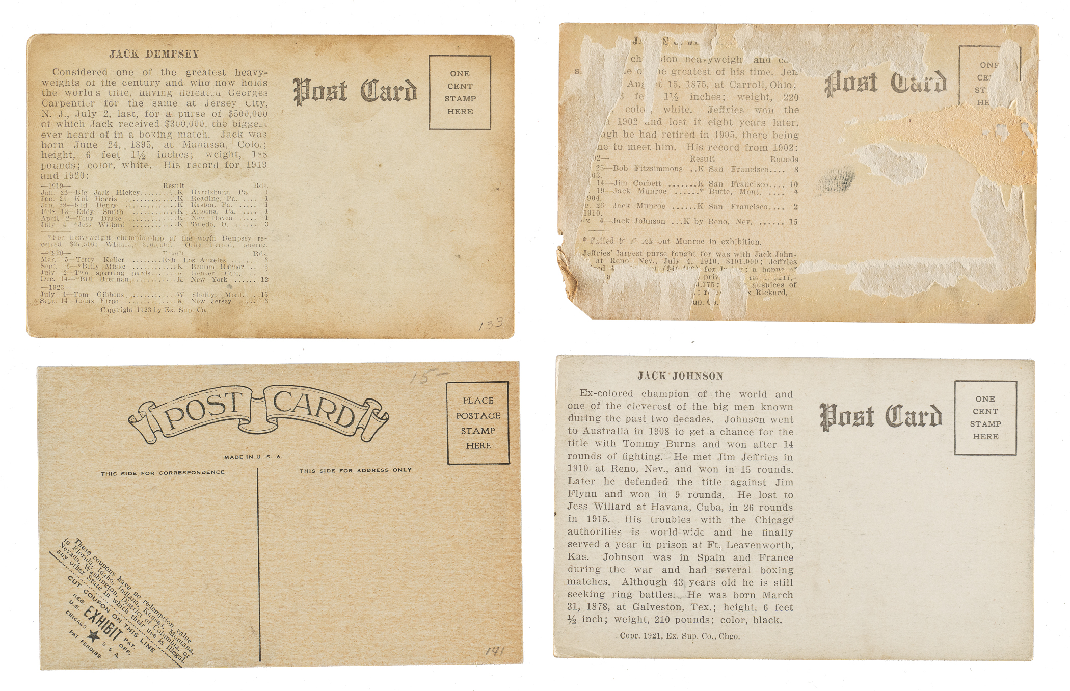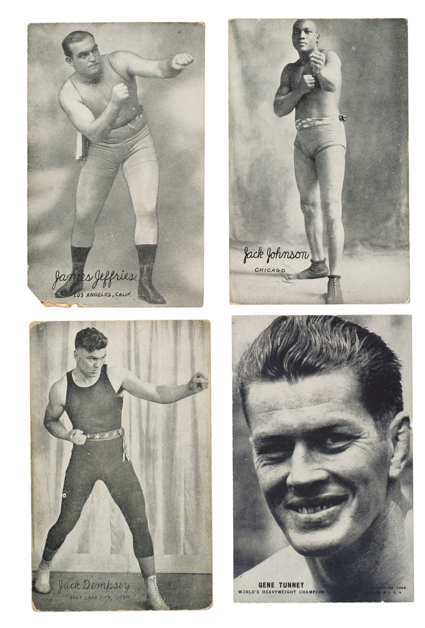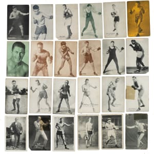 Presented is a collection of 131 boxing cards from the 1921 to 1928 Exhibits boxing series, highlighted by Jack Johnson, Jack Dempsey, and Gene Tunney. Condition technically ranges from Pr to Fr (including 5% better, approximately ten trimmed, and a few altered with tape), approximately half of which would have graded a bit higher except for small pencil marks on the reverse. This collection consists of the following: 1) 1921 Exhibits (25 cards): Bronson, F. Burns, T. Burns (tape repair on front, otherwise Pr), Chip, Conley, Coulon, Cross, Dillon, Driscoll, Fitzsimmons (tape repair on front and back mostly missing), Fulton, Gans (small pencil mark on reverse, otherwise Gd+), Gibbons, Jeannette (small pencil mark on reverse, otherwise Vg-Ex), J. Johnson (Vg), McFarland, Mitchell, Moran, T. Murphy, B. Murray, O'Dowd, Papke, T. Ryan, F. Walsh, and Wolgast. 2) 1922 Exhibits (8 cards): Carter, Dolan, Farren, Hammer, Jamieson, Joyce, O'Brien, and O'Dowd. 3) 1923 Exhibits (21 cards): Benjamin, Burman, Clabby, Dempsey (small pencil mark on reverse, otherwise Vg), Eagel, Flowers, T. Gibbons, M. Gibbons, Green, P. Herman, F. Johnson, Kansas, Kilbane, Langford, Leonard, Lynch, Ritchie, Schoell, M. Smith, Wells, and K. Williams. 4) 1925 Exhibits (35 cards): Ballerino, Berlenbach, Burnbrook, Chapman, Curtin, Delaney, Doyle, T. Gibbons, Goldman, Herman, F. Johnson, J. Jones, Kramer, Leonard, Loughran, Mandell, McTigue, Montgomery, P. Moran, Norfolk, O'Donnell, Petrone, Poluso, Renault, Sangor, D. Shade, Silvers, Slattery, H. Smith, Stone, B. Taylor, Tremaine, A. Walker, J. Wilson, and Zivic. 5) C. 1925-1929 Postcard-Back Exhibits (8 cards): Britton, Burman, Callahan, Loughran, Rosenberg, Singer, Tunney (small pencil marks on reverse, otherwise Ex), and Wallace. 6) C. 1925-1929 "Blue Boxers" Exhibits (1 card): Tendler. 7) 1926 Exhibits (2 cards): T. Morgan and K. Wagner. 8) 1927 Blank-Back Exhibits (1 card): Cohen. 9) 1927 Exhibits (9 cards): Burke, Dundee, Fields, Garcia, Gorman, Hansen, Hurley, McGraw, and Suggs. 10) 1928 Exhibits (11 cards): Farr, Freeman, Fuller, Kaufamn, Mello, Petrone, Risko, Routis, Seifert, Tenorio, and Tunney (partially erased pencil on reverse, otherwise Vg). Also includes the following ten exhibits from series we were unable to identify, mostly due to back damage: Bass, Dundee, Garcia, Griffiths, Jeffries (Pr, with bottom-left corner clipped off), O'Dowd, Slattery, Sullivan, Tunney (Pr, with bottom-left corner clipped off), and Willard (tape repair on front, otherwise Pr). A sizable collection of cards from these desirable 1920s boxing issues. Total: 131 cards.