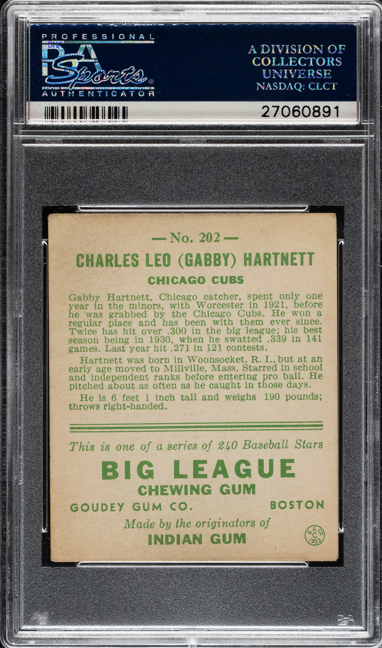 Graded VG-EX 4 by PSA. Chicago Cubs Hall of Famer Gabby Hartnett.