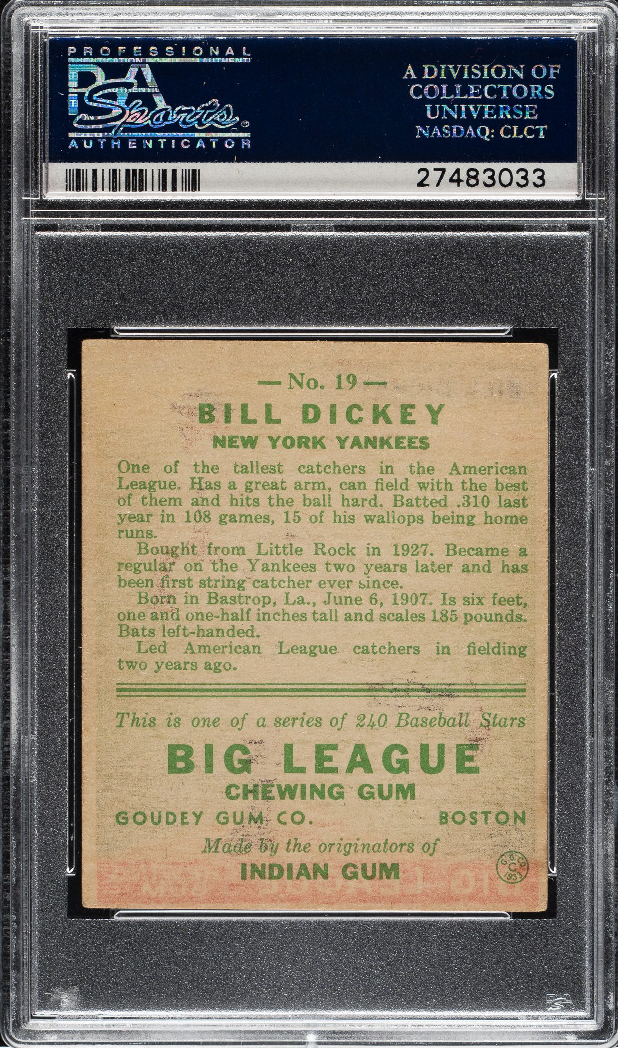 Lot # 1417: 1933 R319 Goudey #19 Bill Dickey PSA VG-EX 4