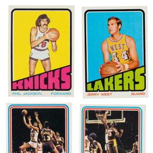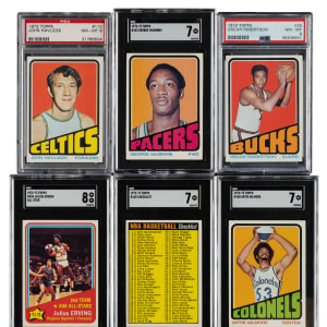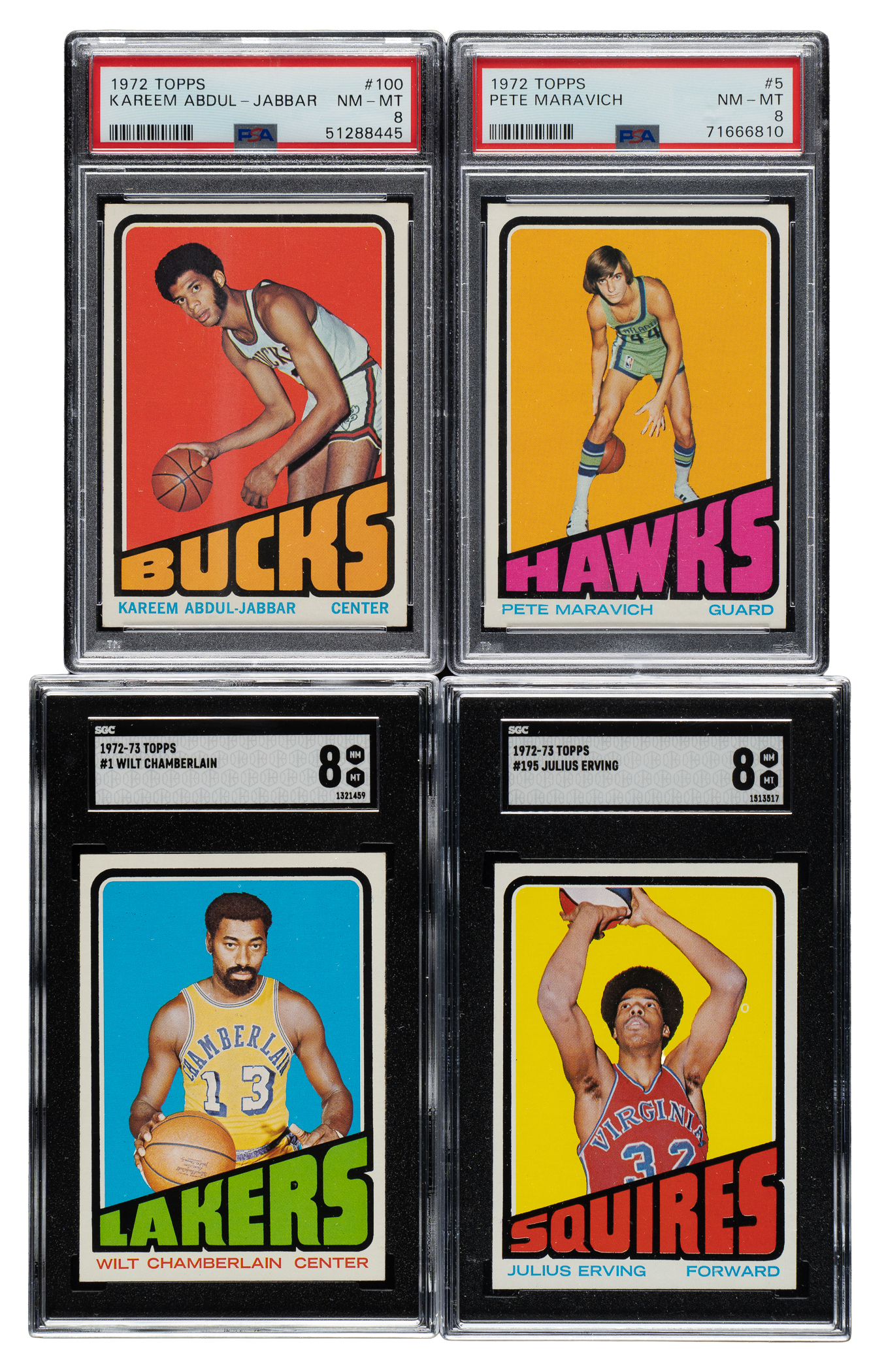 Outstanding complete set of 1972-1973 Topps basketball cards, consisting of 264 different cards. The 1972-1973 Topps set is very popular among collectors for its bright colors and funky text, both telltale signs of an early 1970s issue. The set is loaded with stars and Hall of Famers, including Pete Maravich, Wilt Chamberlain, Kareem Abdul-Jabbar, and rookie cards of Julius Erving, Phil Jackson, George McGinnis, and Artis Gilmore. Twenty-eight cards have been professionally graded and encapsulated by PSA (18) and SGC (10). PSA Grading Composite: NM-MT+ 8.5 (1 card): #42 Dandridge (SGC). NM-MT 8 (16 cards): #1 Chamberlain (SGC), 5 Maravich, 10 Haywood (SGC), 25 Robertson, 28 Thurmond, 45 White, 55 Silas, 92 Nelson, 100 Abdul-Jabbar, 110 Havlicek, 129 Reed, 130 Hudson, 195 Erving RC (SGC), 210 Brown, 218 Paultz (SGC), and 255 Erving AS. NM 7 (11 cards): #35 Bing, 44 Barry (SGC), 50 Goodrich, 73 Monroe, 97 Bellamy, 105 DeBusschere, 160 Checklist, 167 Cunningham AS, 180 Gilmore RC, 183 McGinnis RC (SGC), and 215 Cunningham. The condition of the 231-card unencapsulated balance is 47% Nr/Mt to Nr/Mt-Mt, 42% Ex to Ex-Mt, and 11% Vg to Vg-Ex (including a couple lesser). Unencapsulated Keys: #32 Jackson RC (Ex+), 75 West (Ex), 163 Abdul-Jabbar AS (Ex-Mt due to centering), 168 Chamberlain AS (Ex-Mt), and 248 Checklist (Nr/Mt). An extremely attractive and mostly high-grade complete set of this popular 1970s Topps basketball issue, loaded with stars and Hall of Famers. The equivalent SMR value for just the 28 graded cards (factoring in the half grade at the lower whole-grade value) is $5,566. Total: 264 cards. The size/weight of this item requires that there will be an additional shipping charge for this lot.