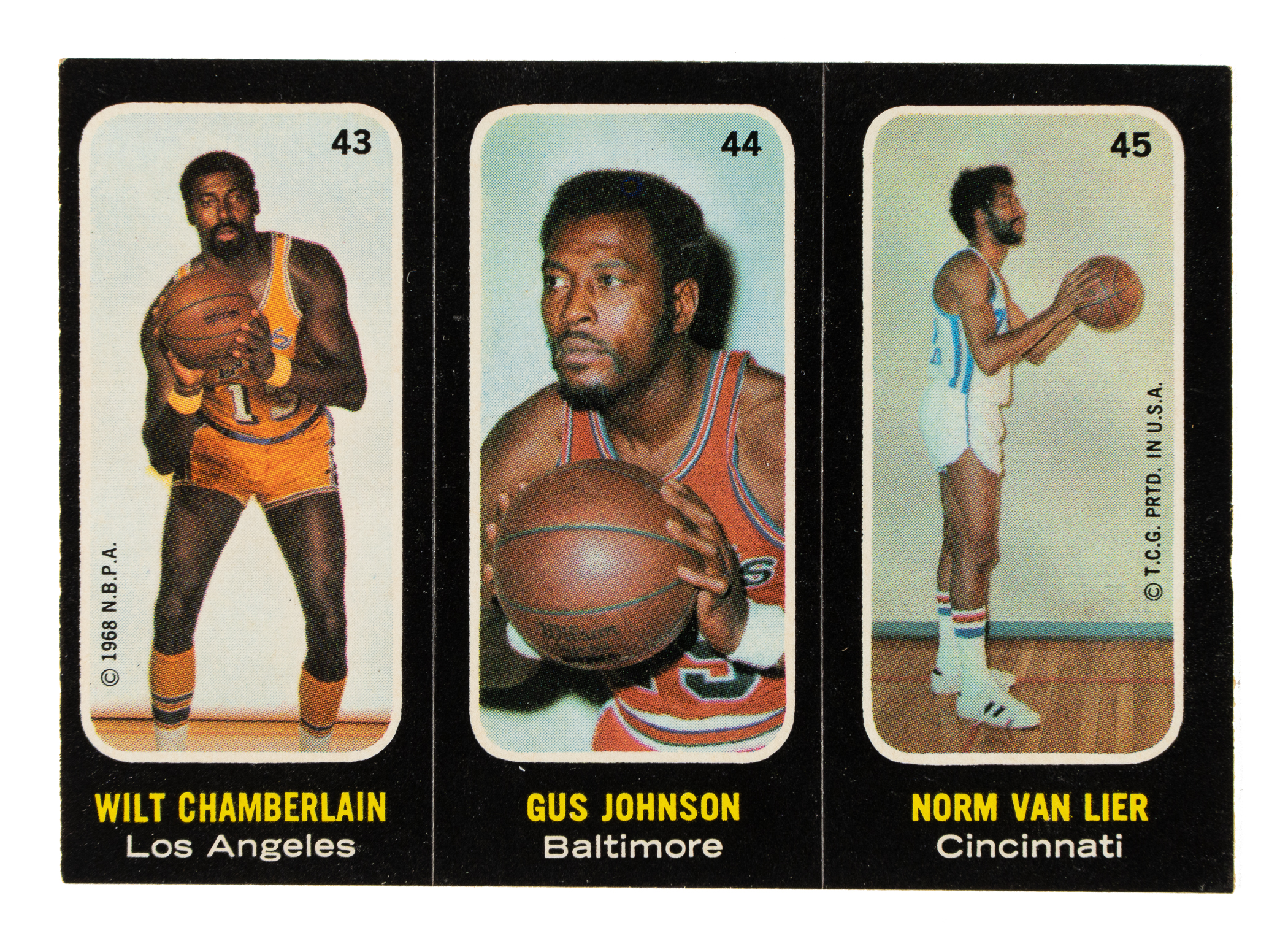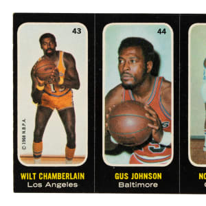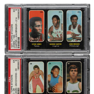 Presented is an outstanding near-complete set of 1971-1972 Topps Basketball Trio Stickers consisting of twenty-five different cards, out of 26 in the set (missing only #23A for completion). This rare insert set is loaded with stars and Hall of Famers, including Lew Alcindor, Wilt Chamberlain, Jerry West, and Oscar Robertson. This was also the first year that Topps included American Basketball Association (ABA) players. Condition is Ex to Ex-Mt, with a couple slightly higher and lower. Two stickers have been professionally graded and encapsulated by PSA. Keys: #19a/20a/21a (EX 5), 22/23/24 Maravich/Kaufmann/Havlicek (Ex-Mt), 28/29/30 Cowens (EX 5), 31/32/33 West/Reed/Walker (Ex+), 34/35/36 Robertson/Unseld/Smith (Ex+), 37/38/39 Hawkins/Mullins/Alcindor (25/75 L/R, otherwise Ex-Mt+), and 43/44/45 Chamberlain/Johnson/Van Lier (Ex). A very attractive and consistent near-complete set of this popular 1970s Topps basketball insert issue, loaded with stars and Hall of Famers. Total: 25 stickers.
