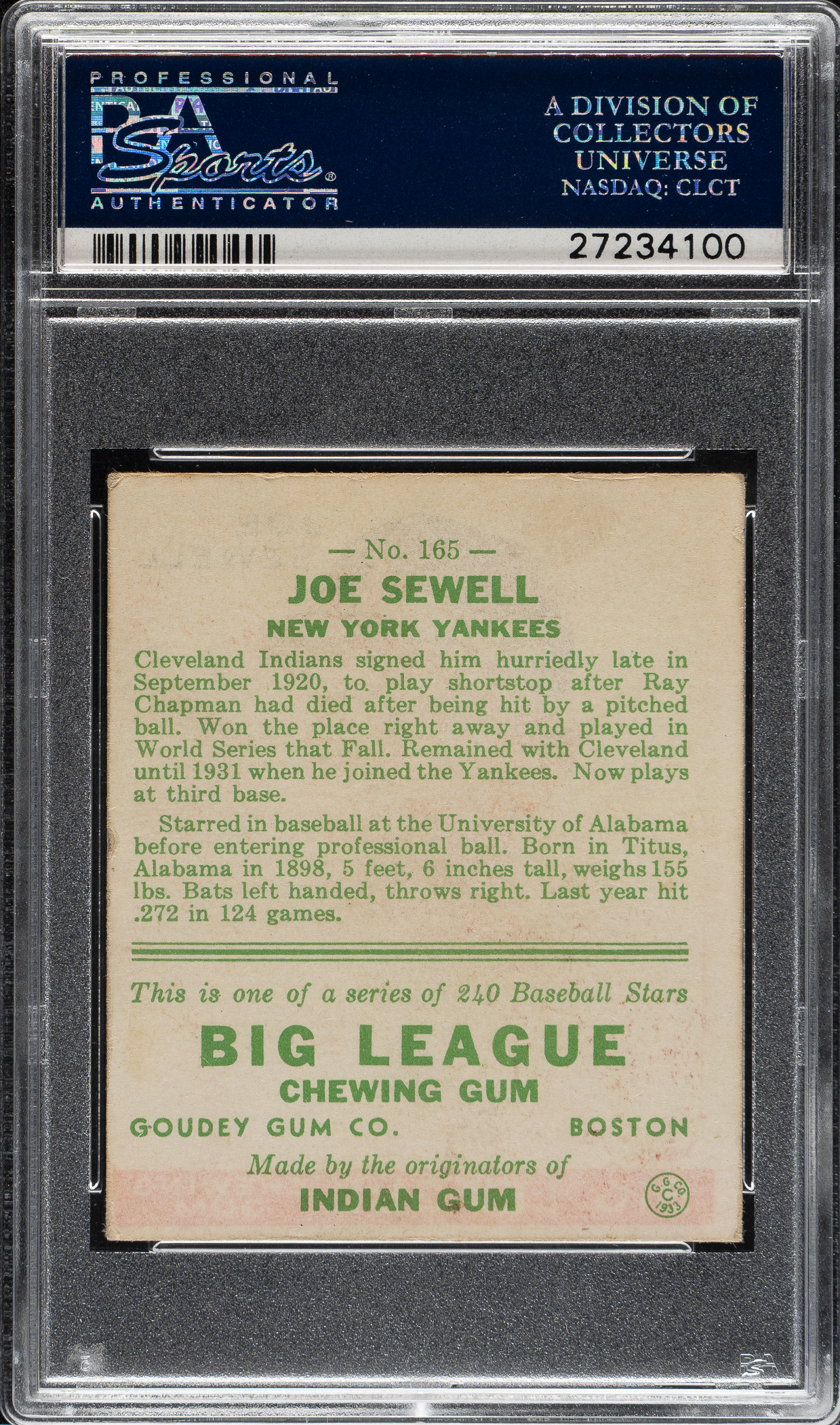 Lot # 1404: 1933 R319 Goudey #165 Joe Sewell PSA VG-EX 4