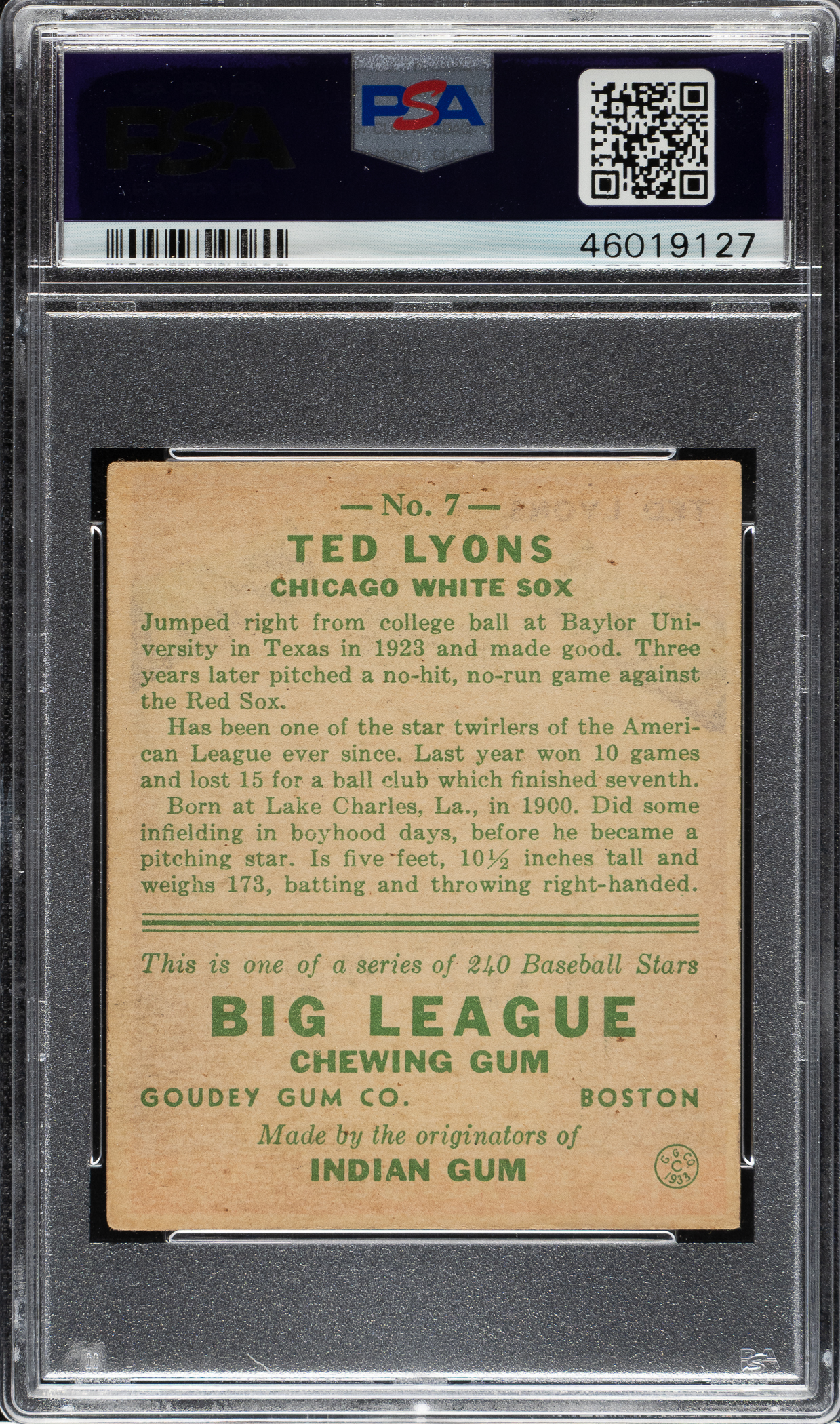 Lot # 1479: 1933 R319 Goudey #7 Ted Lyons PSA VG-EX 4