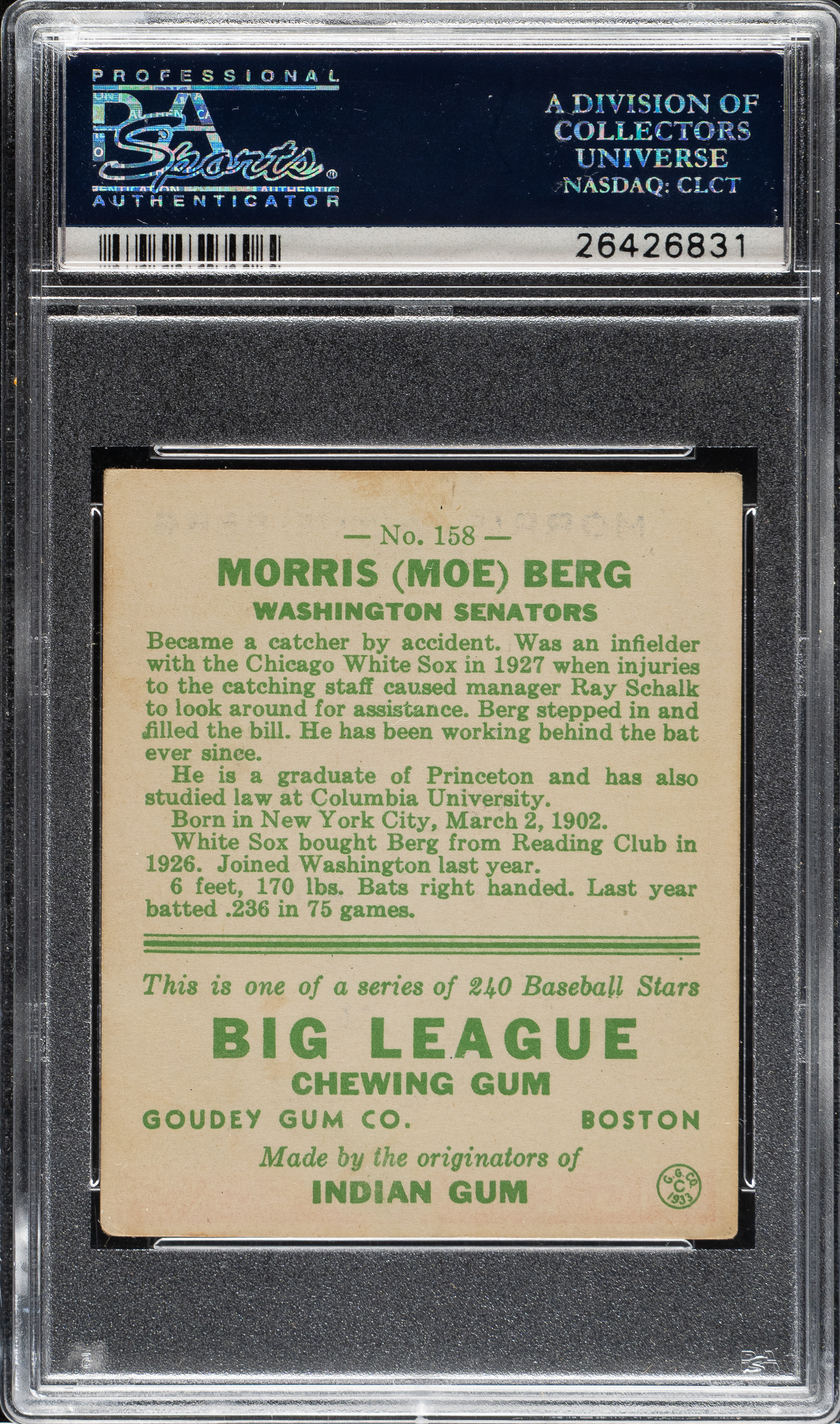 Lot # 1400: 1933 R319 Goudey #158 Moe Berg PSA VG-EX+ 4.5