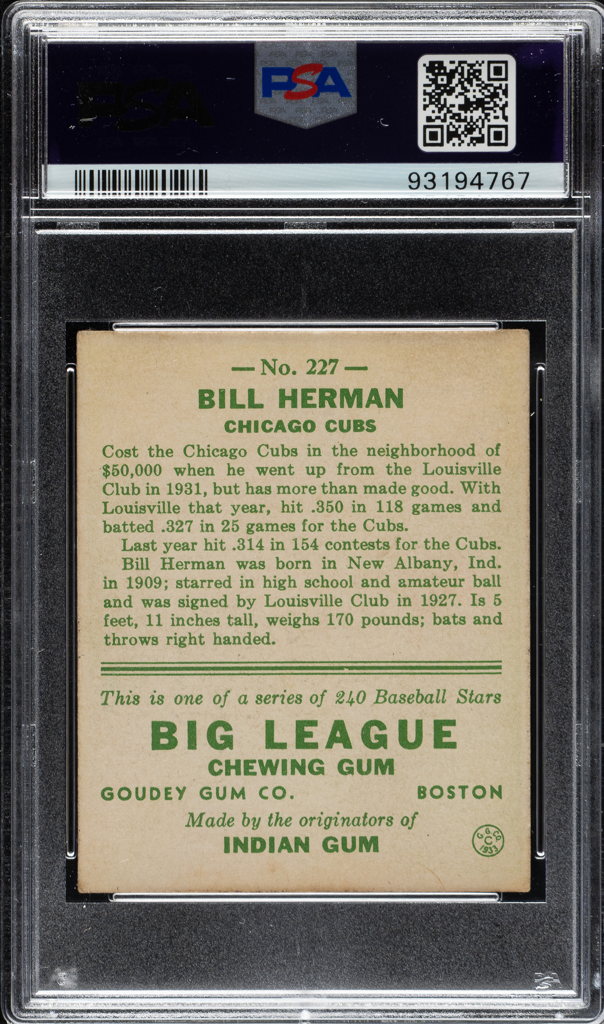 Lot # 1444: 1933 R319 Goudey #227 Bill Herman PSA VG-EX+ 4.5