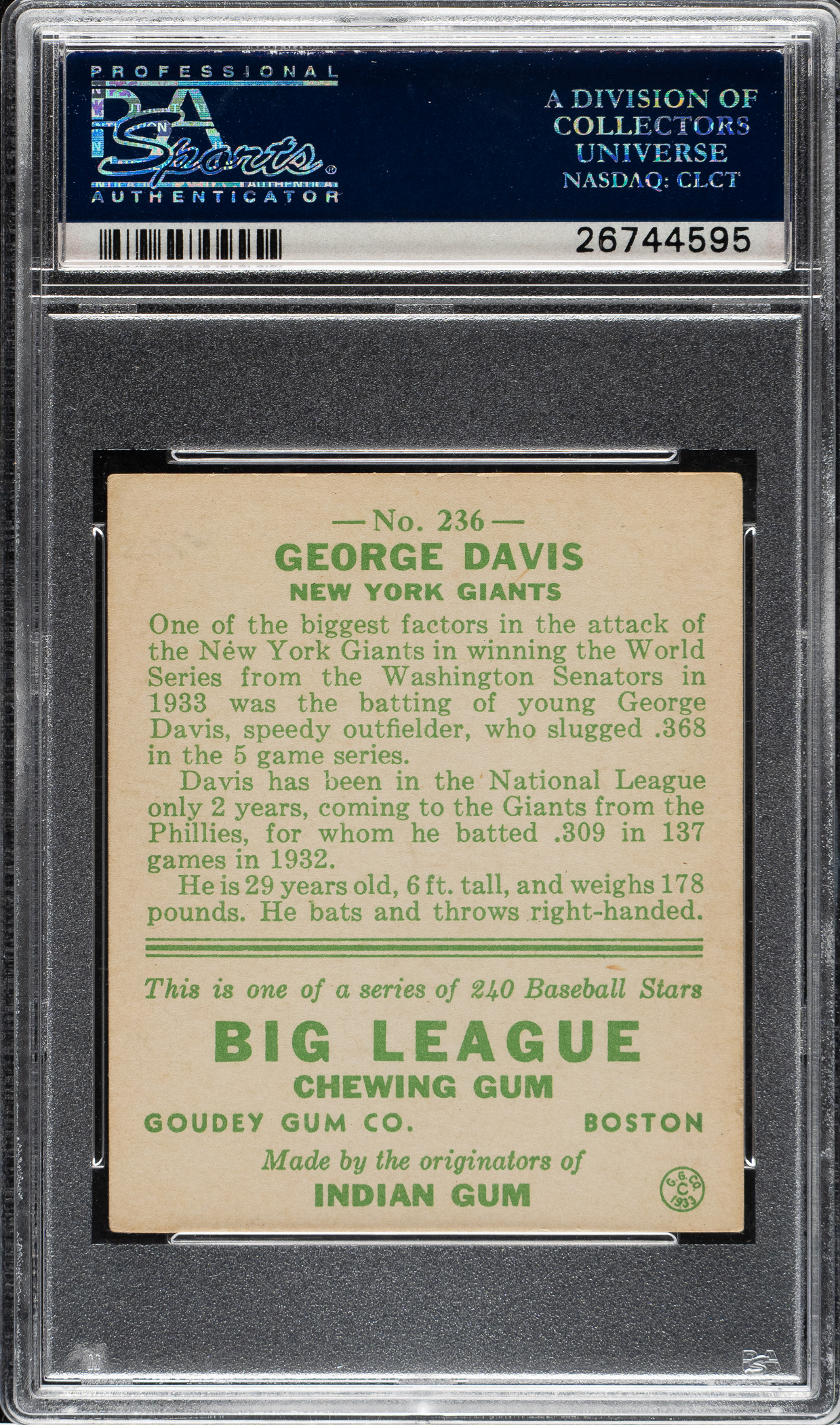 Lot # 1451: 1933 R319 Goudey #236 George Davis PSA EX 5