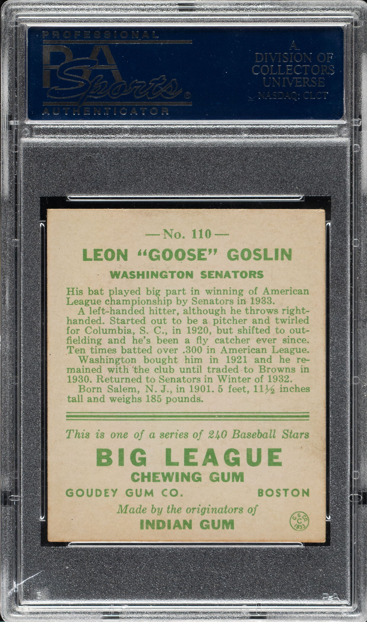 Graded EX 5 by PSA. Washington Senators Hall of Famer Goose Goslin.